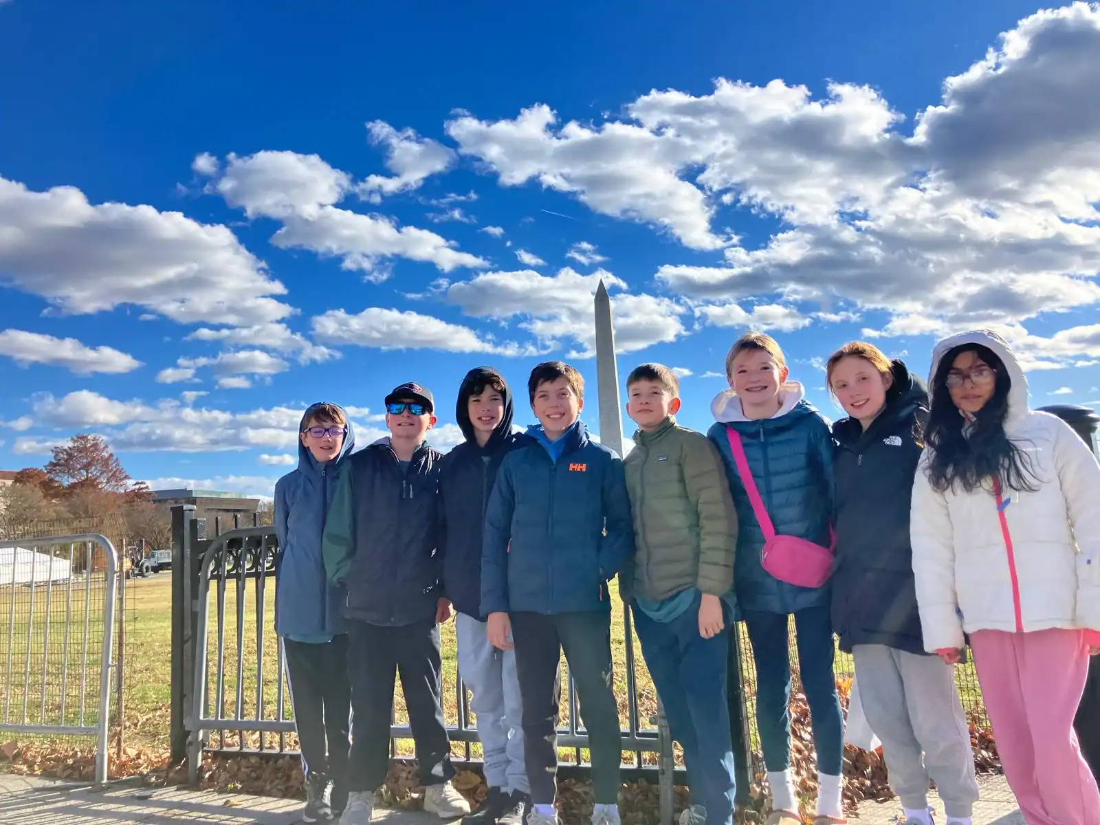 Eight children in winter clothing stand in front of a fence with the Washington Monument and a partly cloudy sky in the background.
