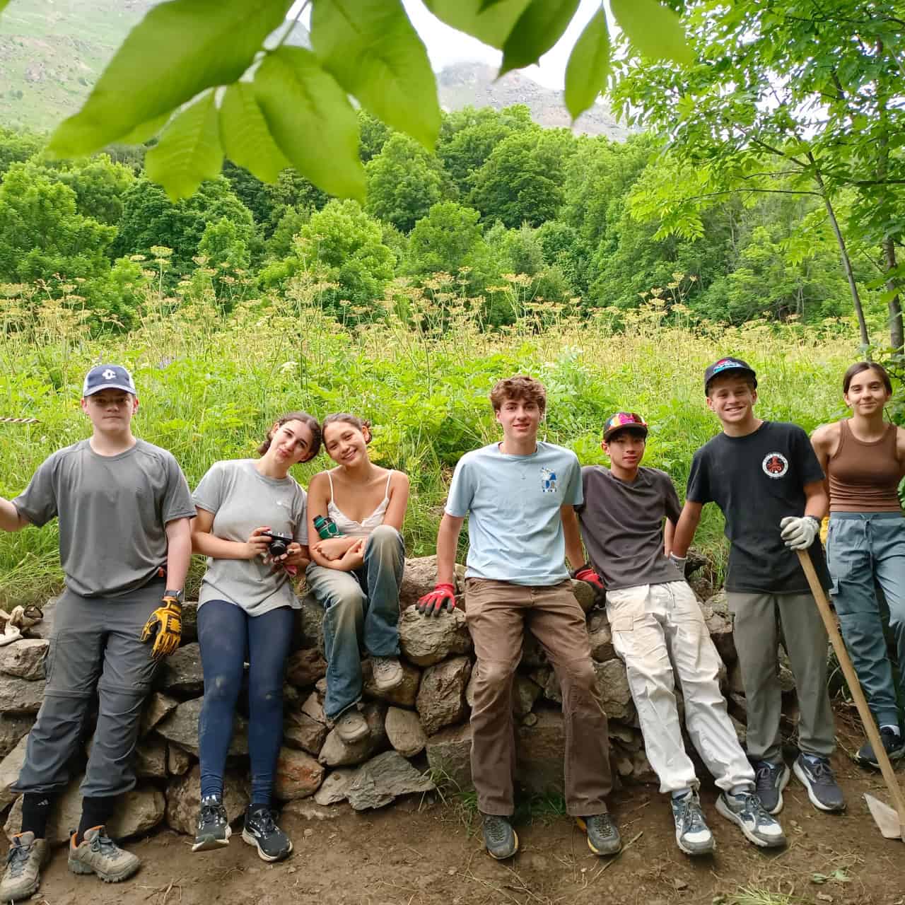 Seven young people in outdoor work clothes sit and stand by a low stone wall in a green, wooded area, with tools and gloves visible—capturing the spirit of a Costa Rica student travel adventure.