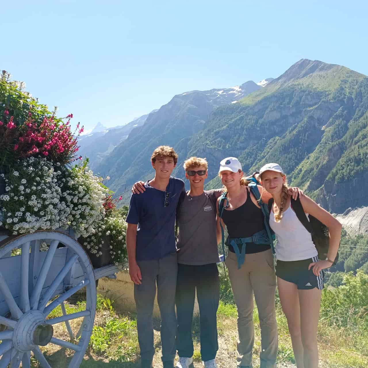 Four people stand together outdoors in front of a scenic mountain landscape with a cart of flowers.