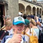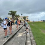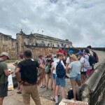 This morning, May 1st, we awoke from our deep sleep to the beautiful Puerto Rican sunrise. The palm trees are very exotic! After breakfast which consisted of pancakes and eggs muffins. We then jumped in the vans and drove to Old San Juan to learn about it’s rich history. We explored the town and even visited castles! After the humid morning faded to rain we made our way to a local restaurant. We ate chicken, beef, and tostones which are very good with ketchup! After lunch we walked to Kalle Fortaleza, a street where we did lots of shopping! Caden got shorts and a hat, and I got some gifts for my familia. Once we had explored the many tourist shops we hopped back in the refreshing air conditioned vans to make our way to the art district. Our guides showed us the deeper meaning in the murals around the streets. It was a captivating walk filled with bright color and creativity. Now after the great day of communing around the San Juan area, we finally were on our way back to the Big Yellow House. Where we relaxed and even played soccer and basketball in the open yards of the house. Finally it was time for dinner! We were all so hungry from the day that we gobbled up the delicious Puerto Rican food. We had more tostones and Amarias. We even got some fruit punch which of course Etai spilled. To settle down our evening we watched a documentary on Puerto Rican politics and economy. Now it is time to go to bed. We have showered up and are ready for our sunrise swim in the morning! Good night everybody!