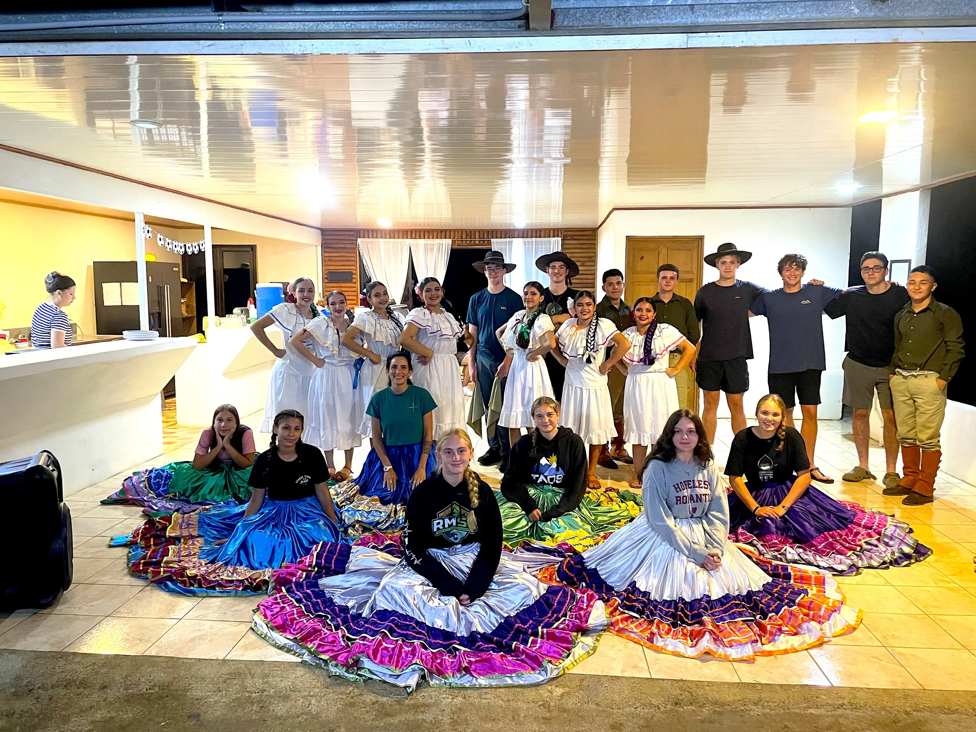A group of people pose indoors; some stand in traditional dresses and hats, while others sit in colorful skirts or casual clothing on the floor.