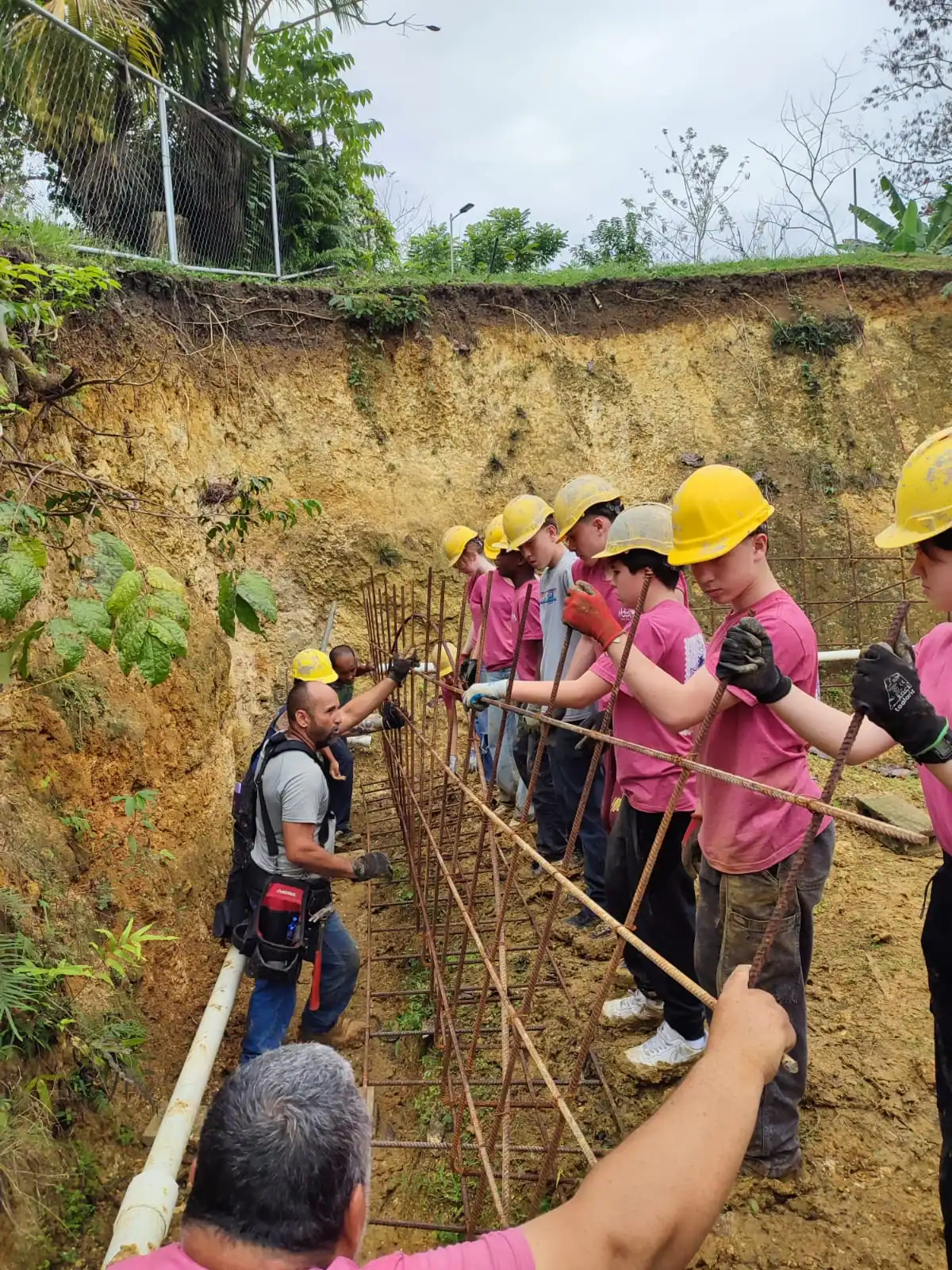 With the foundation dug out, it was time to begin creating the bones of the house. Synergy 8th grade students worked carefully to tie rebar, laying the structural framework that will support the wall molds. Their attention to detail in this early stage is critical to ensuring the strength and stability of the new addition.