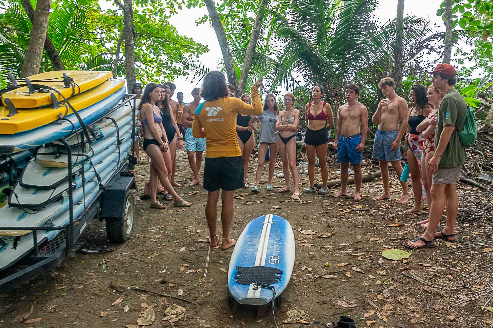 A group of people stand in a circle on a beach, listening to an instructor near a stack of surfboards and a single board on the ground.