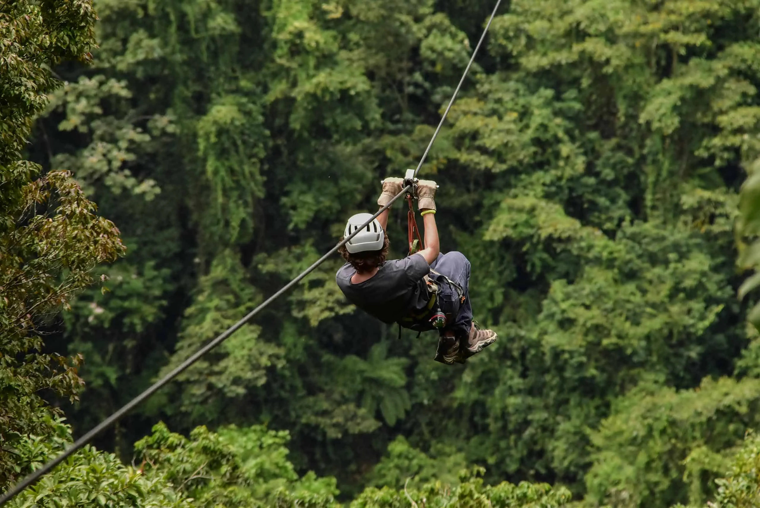 A person wearing safety gear rides a zipline over a dense, green forest during a student travel program by Global Works.