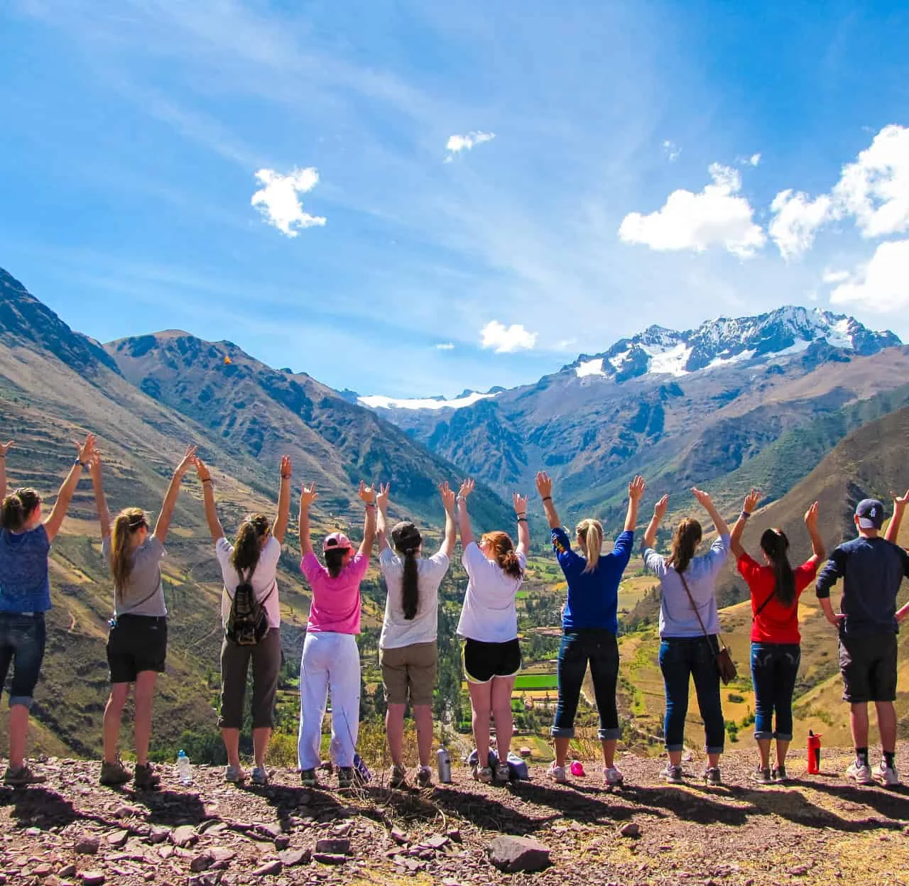 A school group travel program by Global Works brings together adventurers standing on a mountain trail, raising their arms toward snow-capped peaks and a sweeping valley beneath a clear blue sky.