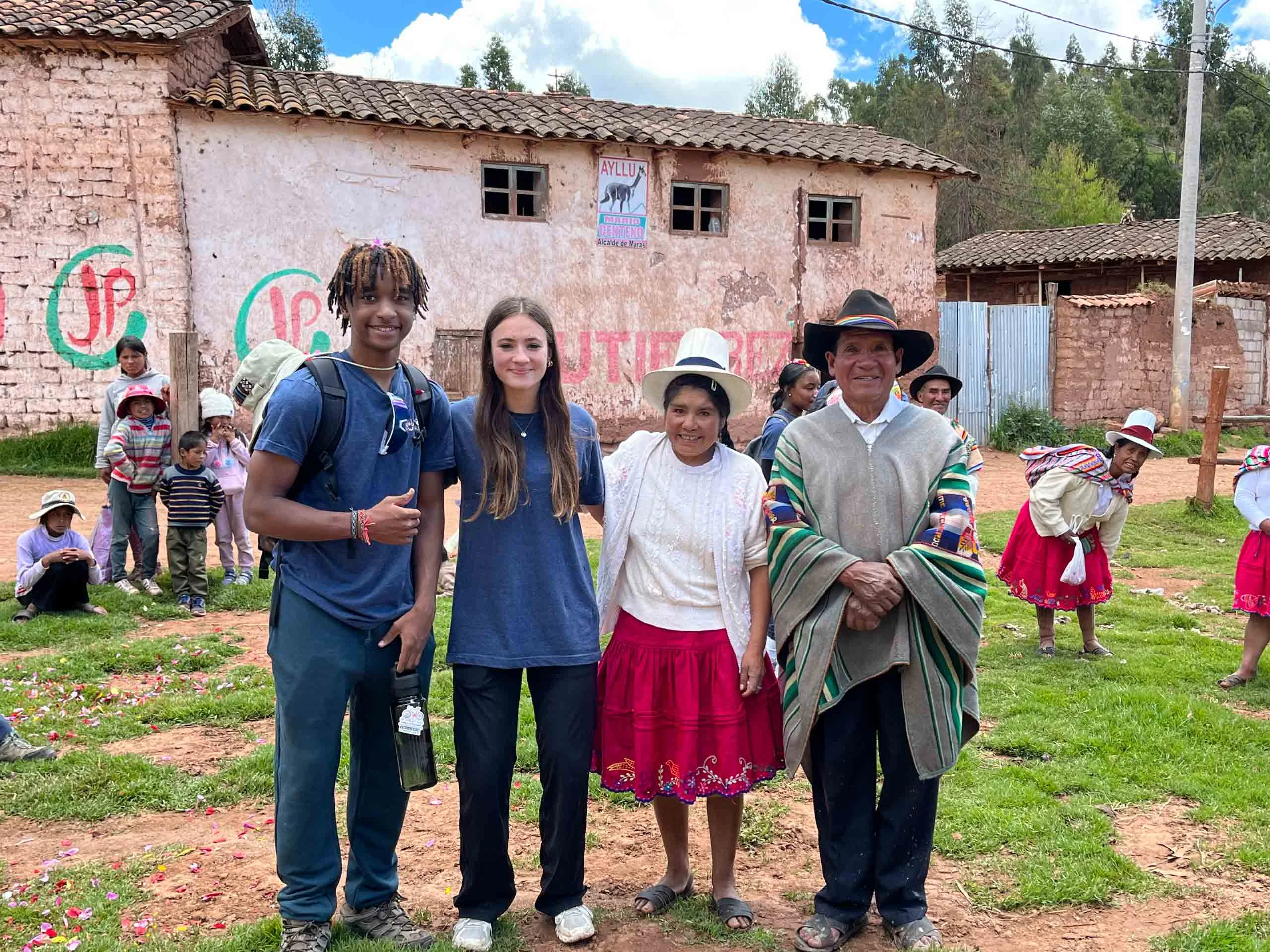 A group of four people stands posing in front of an old building, with several children and adults in the background in an outdoor rural setting during a Global Works student travel experience.