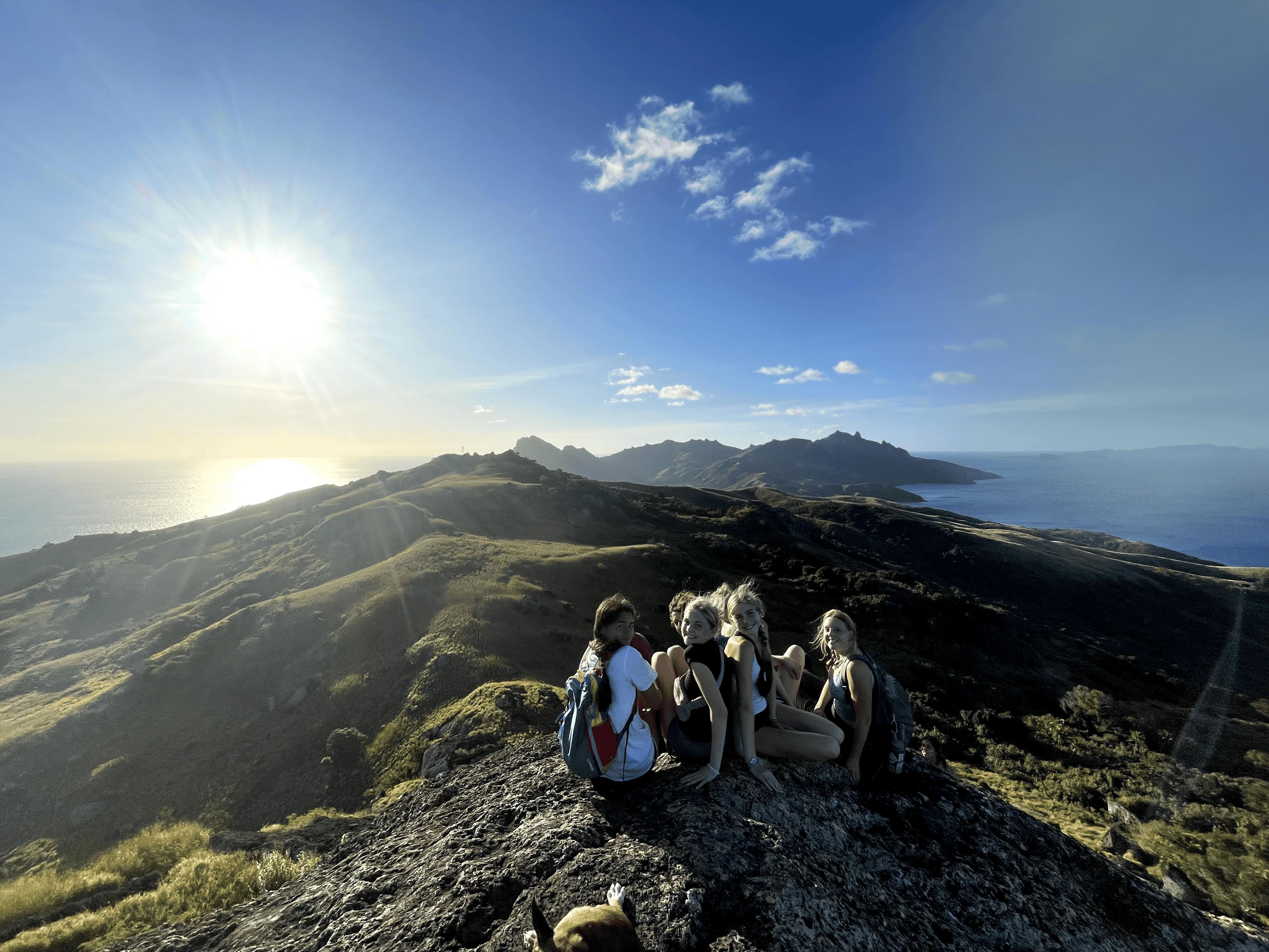 Four people sit together on a rocky hilltop, overlooking a scenic landscape with the sun shining brightly in the sky.