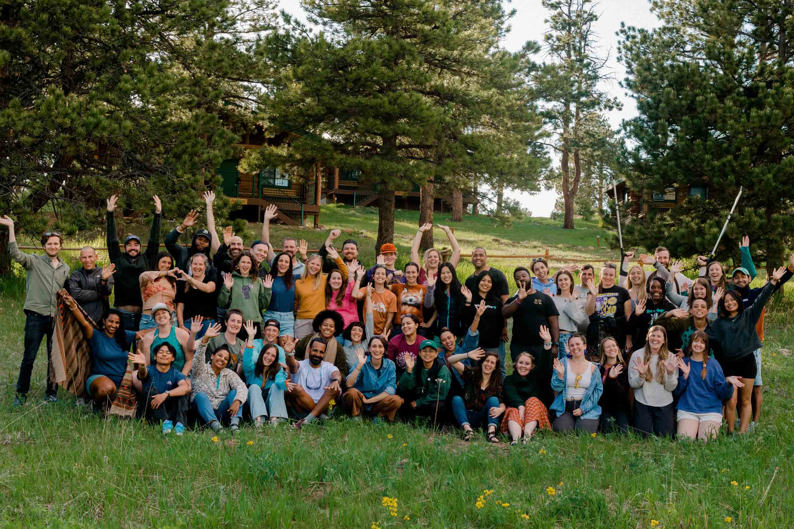 A group of people poses together outdoors on a grassy field with trees and a cabin in the background.