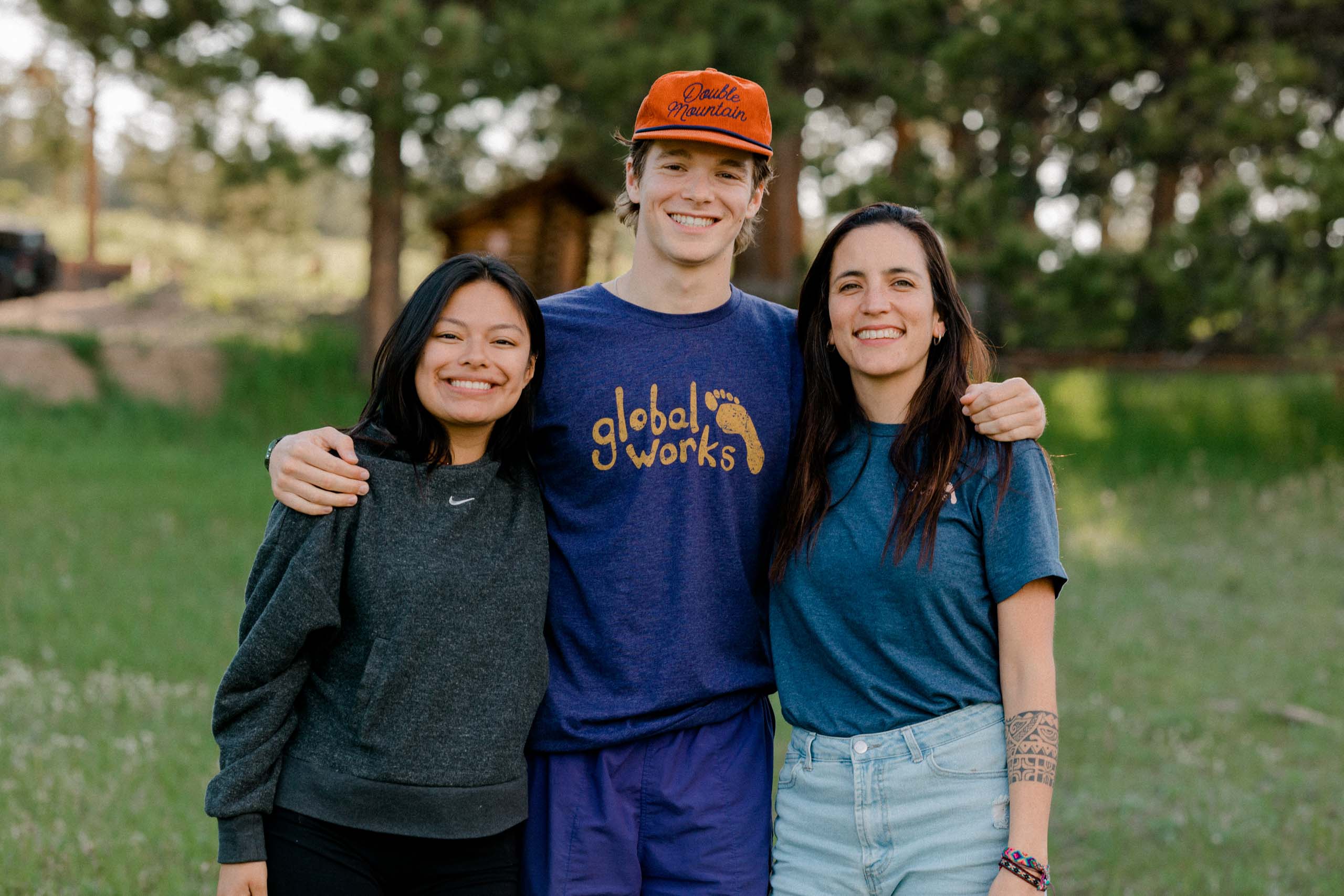 Three people standing closely together outdoors in a grassy area, smiling at the camera. The person in the middle is wearing an orange cap and a blue "global works" T-shirt.