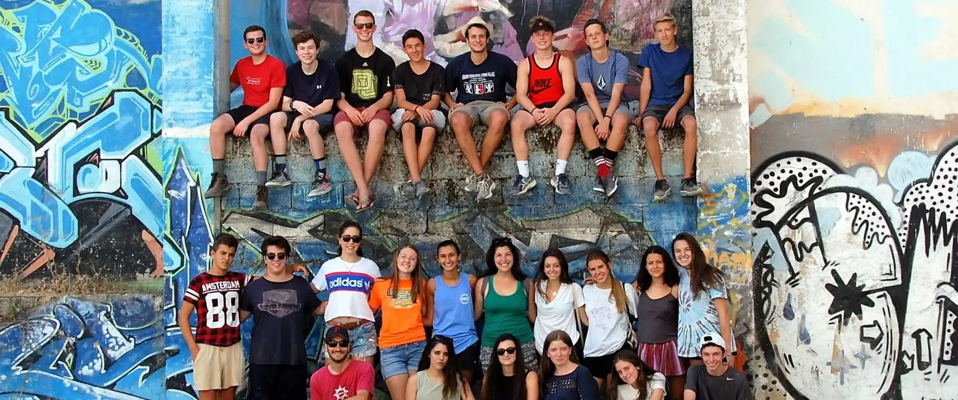 A group of young people sits and stands in front of a large graffiti-covered wall, with some wearing casual summer clothing.