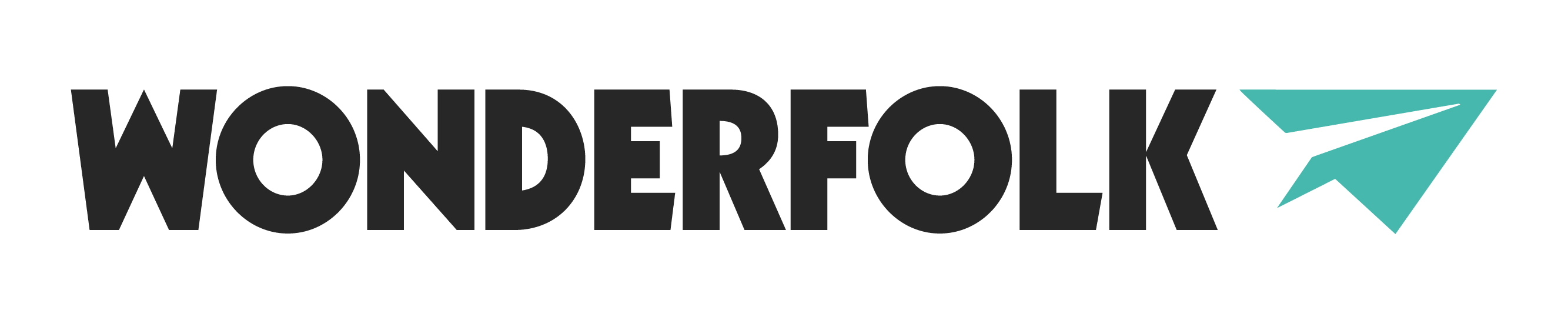Wonderfolk logo with bold black text and a teal paper airplane icon on the right.