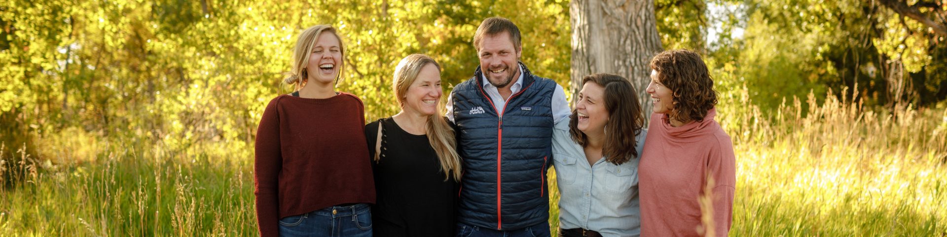 Five people standing outdoors, smiling and laughing in a grassy area with trees and sunlight in the background.