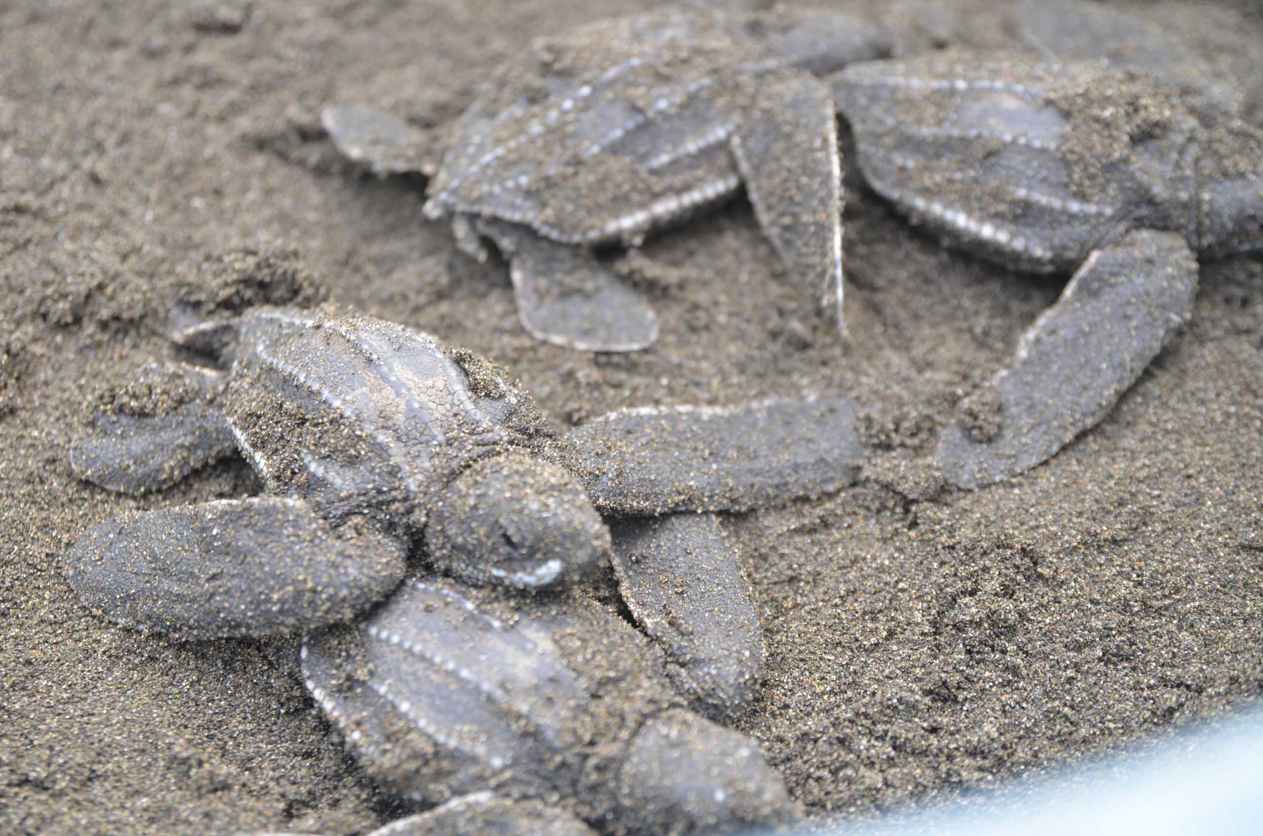 Baby turtles partially covered in sand, lying on a sandy surface.