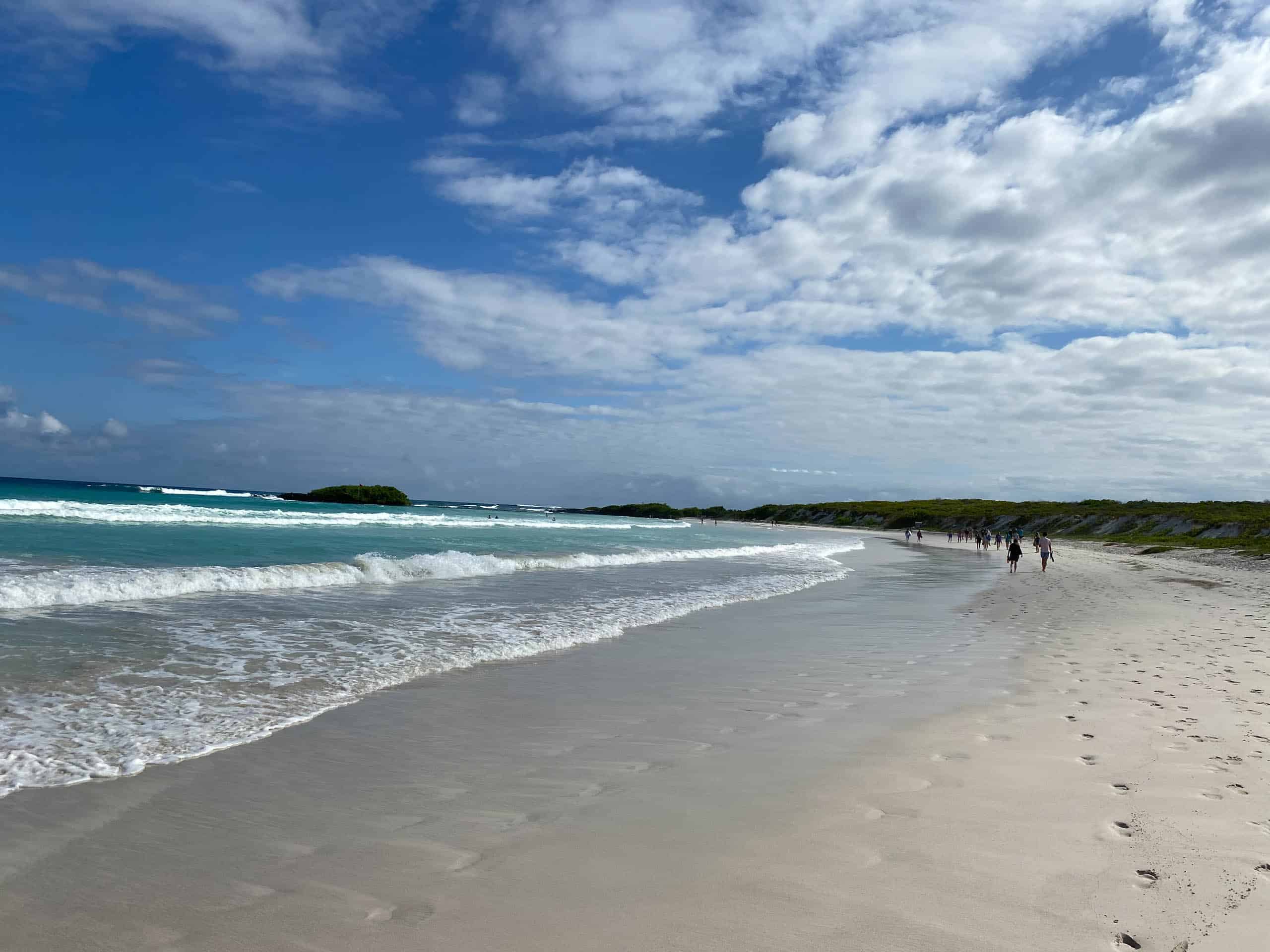 Sandy beach with gentle waves under a partly cloudy sky. A few people walk along the shoreline, and footprints are visible in the sand.