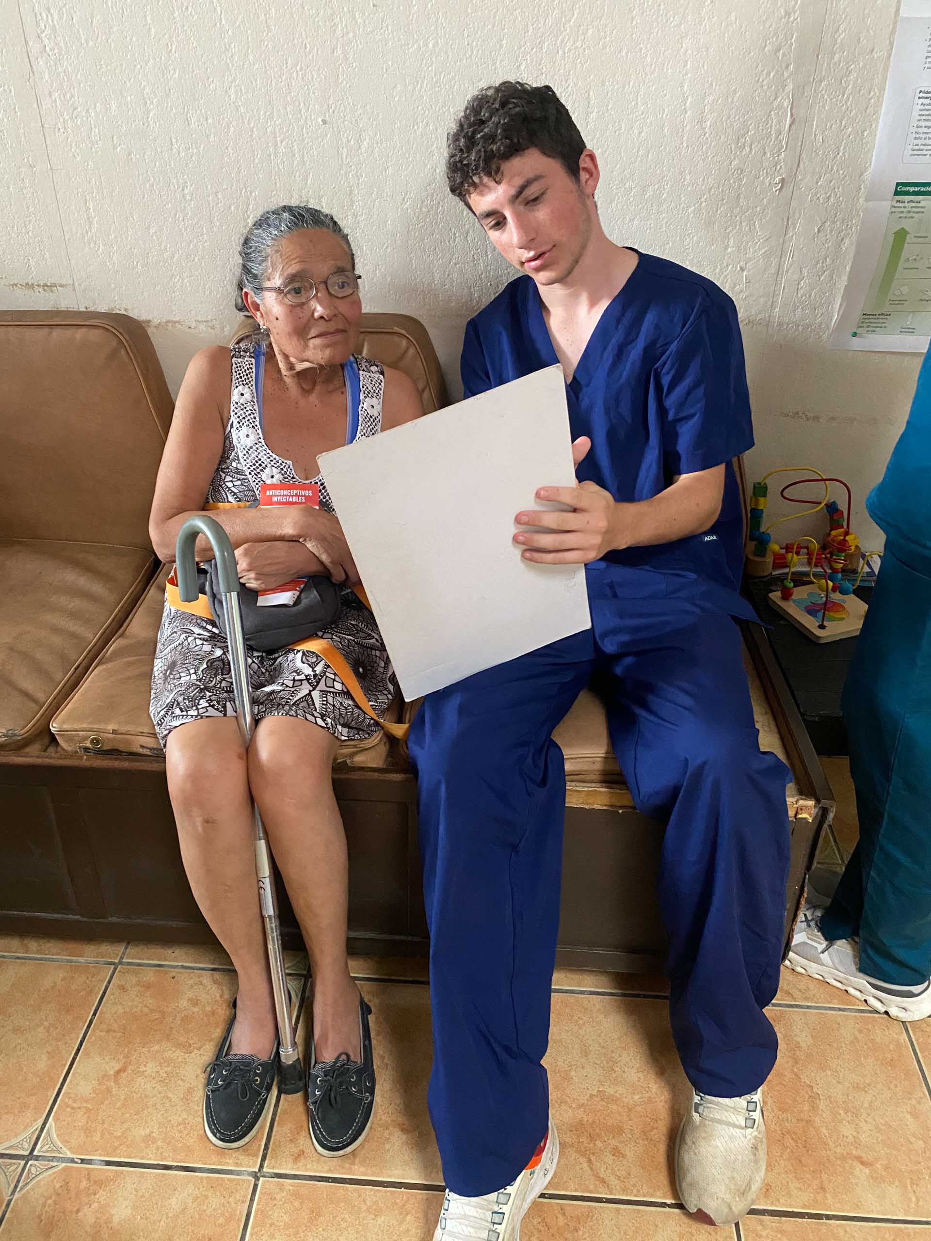 A young student on a medical study abroad school trip in Costa Rica in blue scrubs reviews a document with an older woman in a clinic setting.