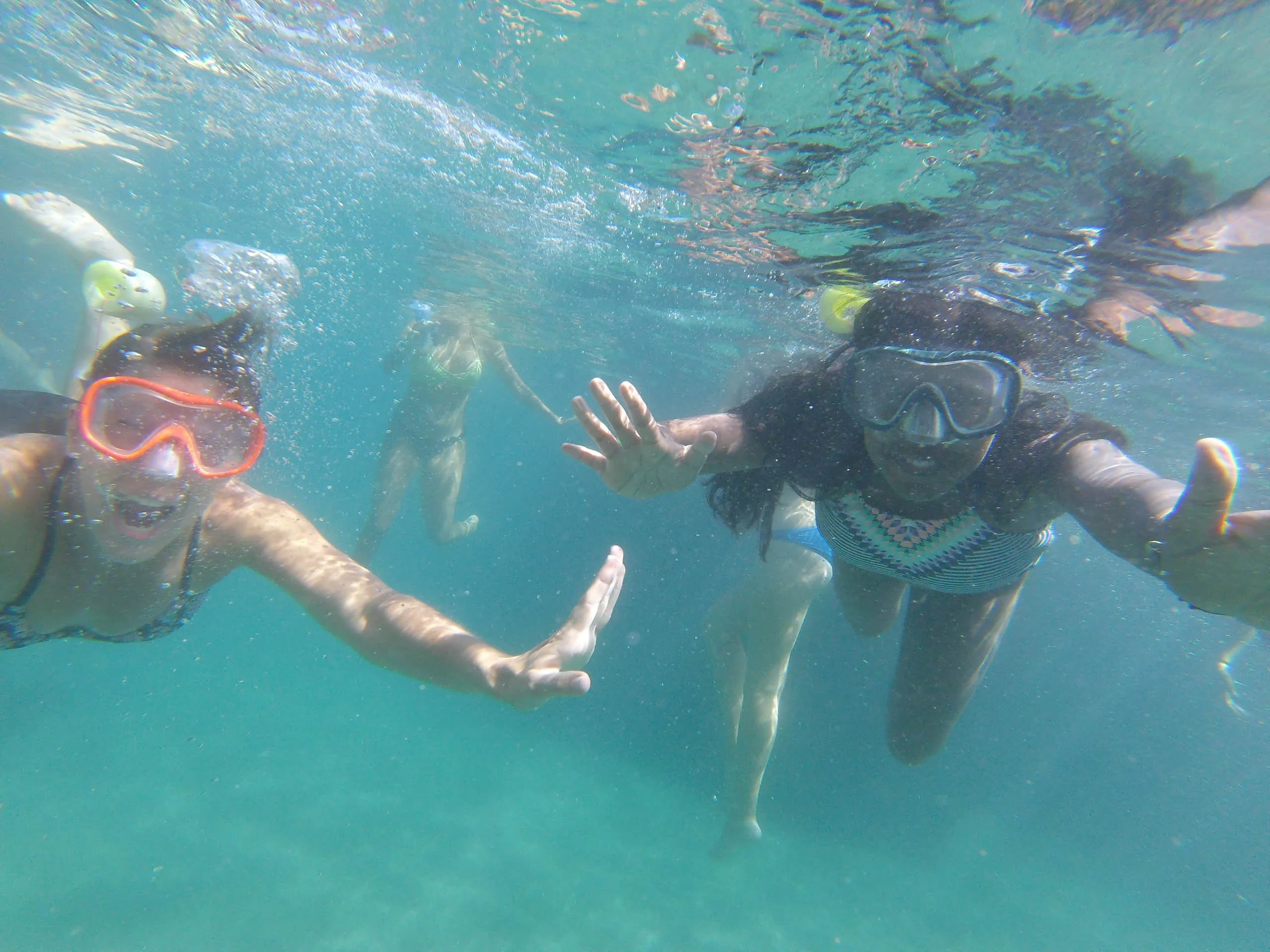 Four people on a Dominican Republic school trip snorkeling underwater, wearing masks and snorkels, with arms extended forward in clear blue-green water.