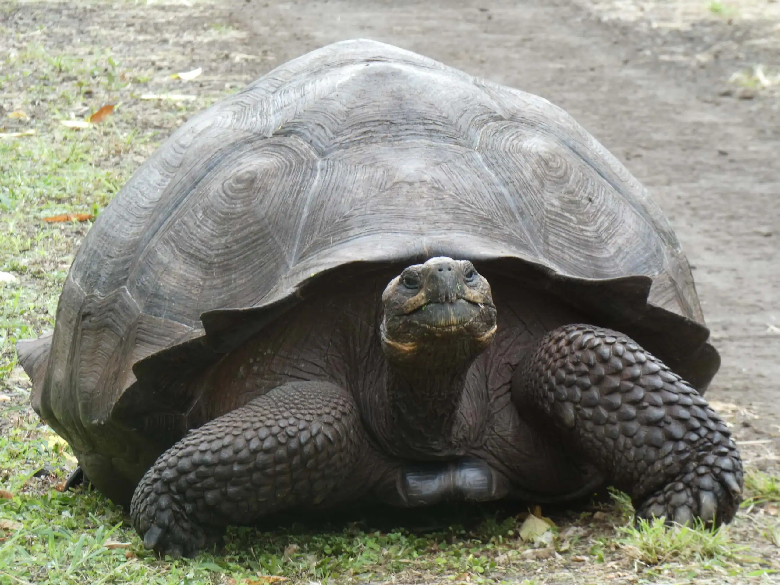 A large tortoise with a dark, domed shell and rough, scaly legs rests on grass near a dirt path—an unforgettable sight for any Ecuador school trip.