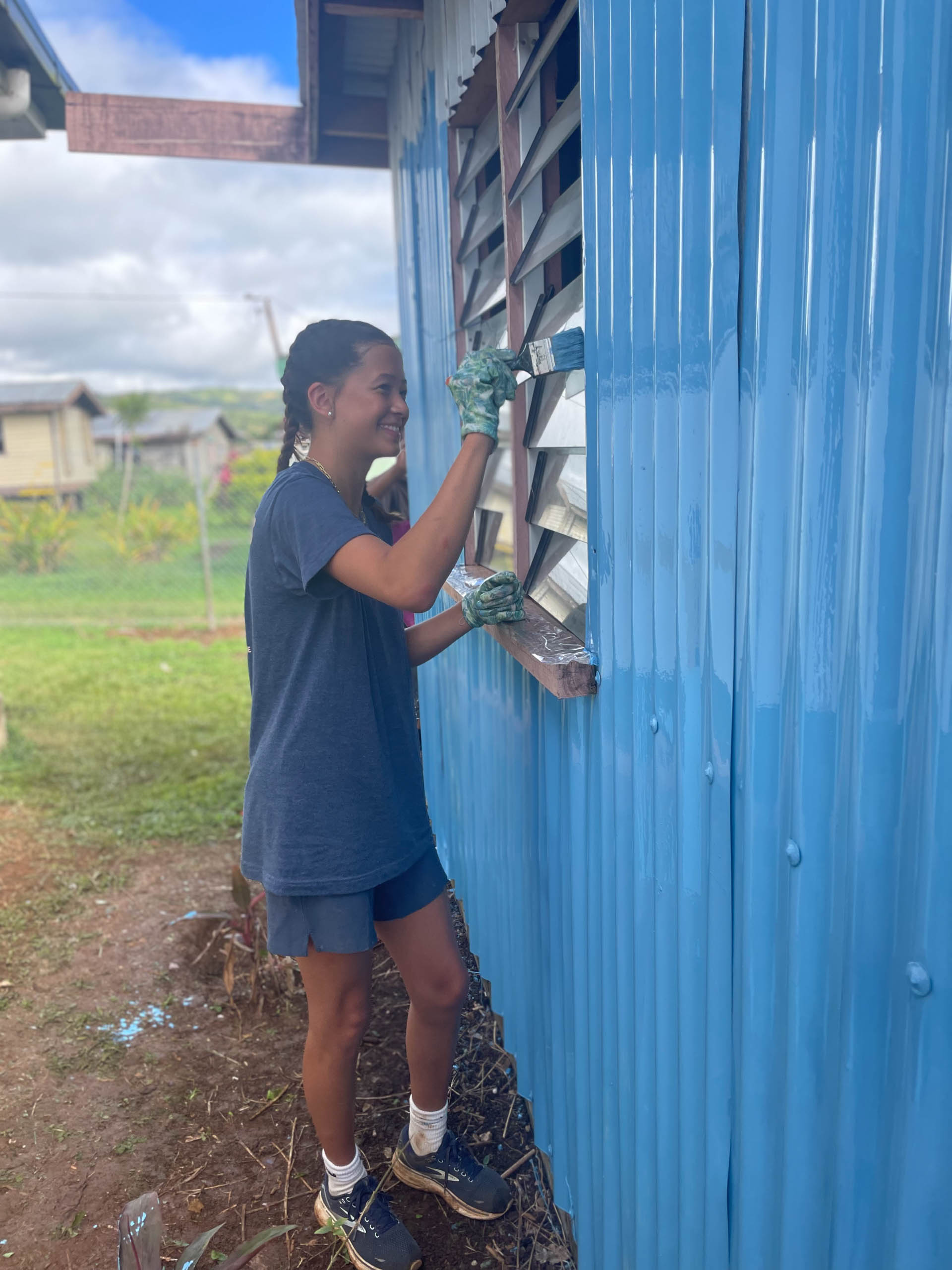 Person painting the exterior wall of a building blue with a brush, standing on grass.