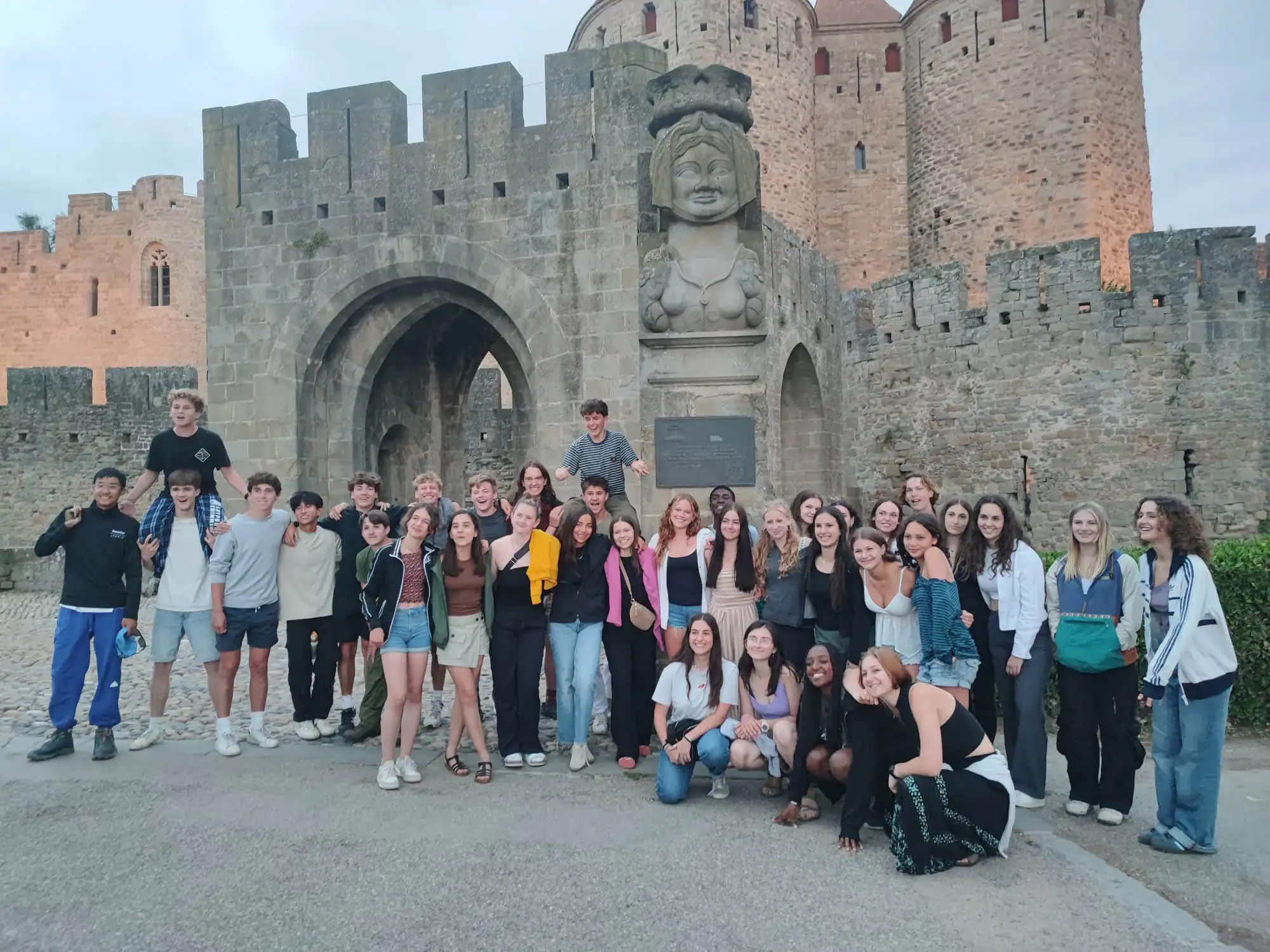 A group of young people on a France school trip pose for a photo in front of a stone castle entrance, featuring an arched doorway and a large stone bust.