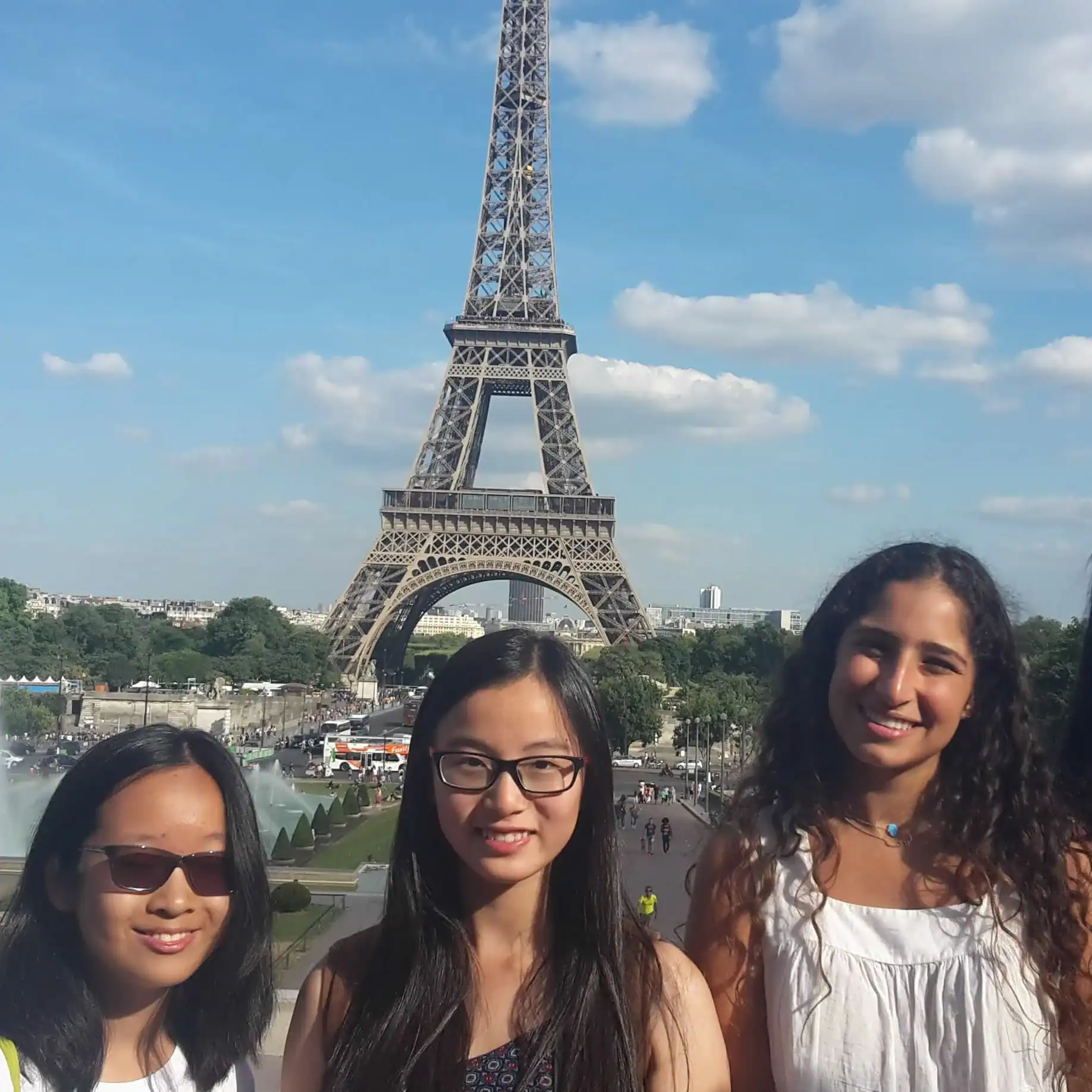 Three students stand in front of the Eiffel Tower in Paris on a sunny day with a blue sky and scattered clouds, capturing memories from their France school trip.