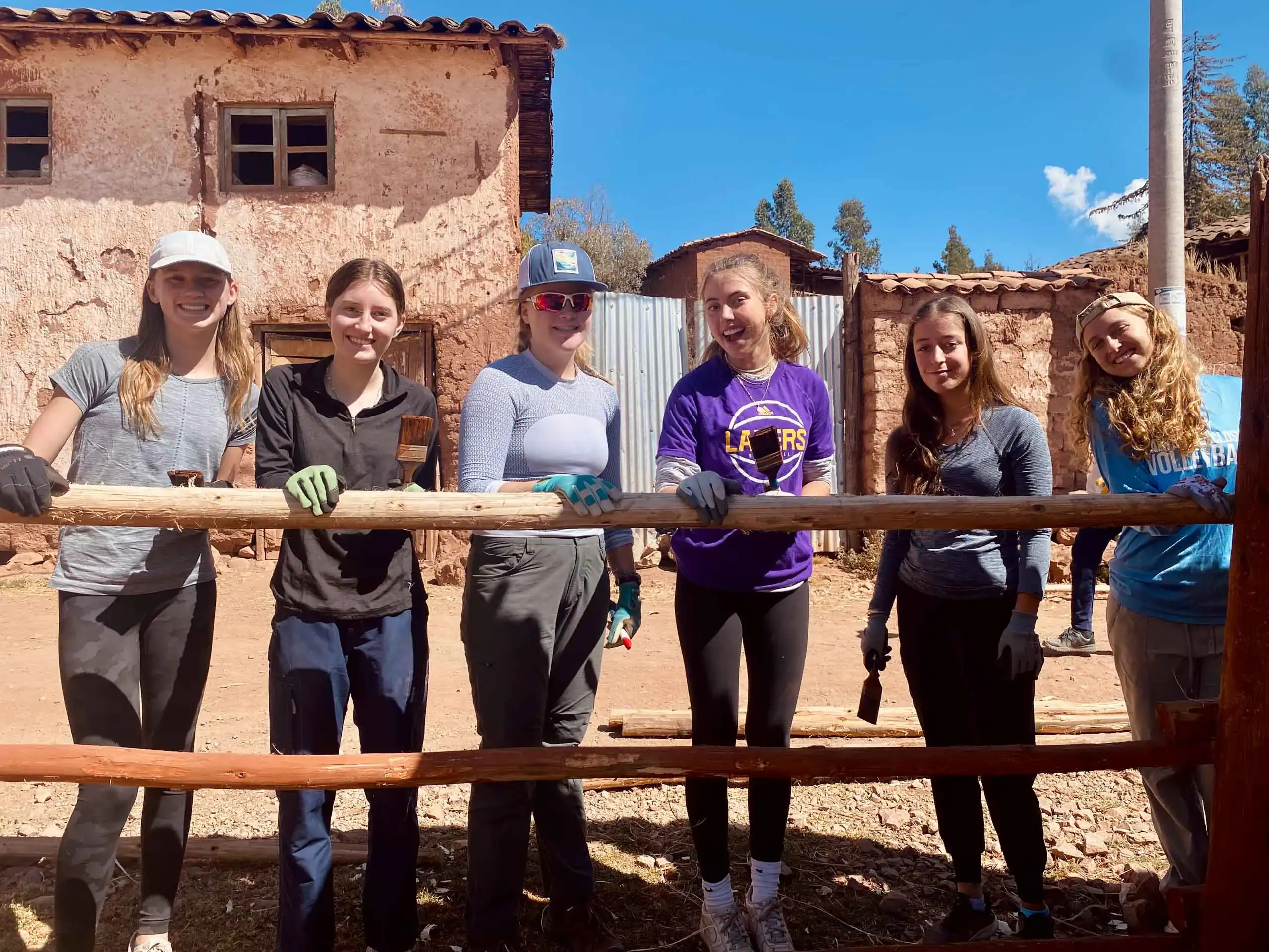 Six students stand outdoors in front of a rustic building during their Peru school trip, smiling and holding onto a wooden fence, wearing casual clothes and work gloves.