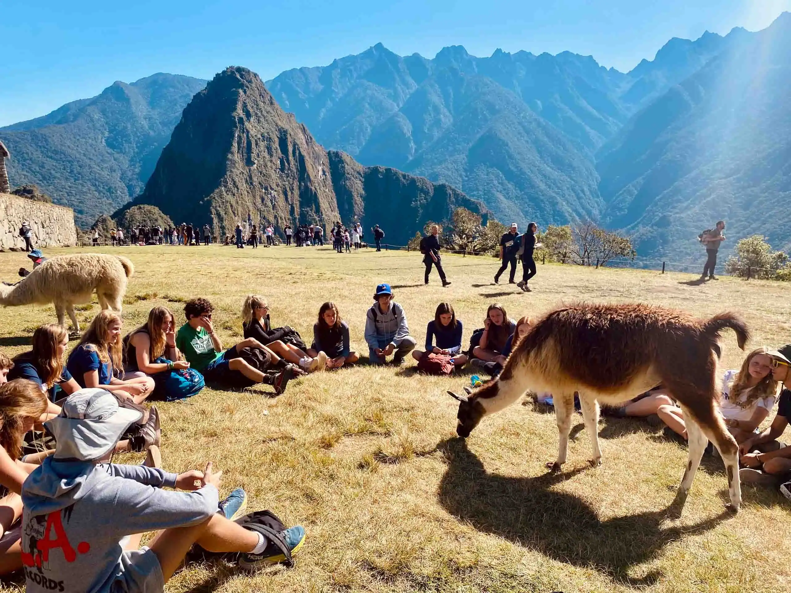 A group of students sit in a circle on grass near llamas with mountains and ruins in the background, likely at Machu Picchu, enjoying a memorable Peru school trip.
