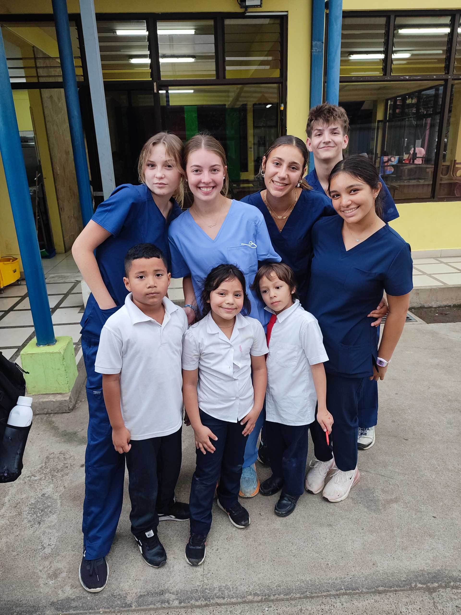 Group of students in scrubs posing with three children in school uniforms outside a building.