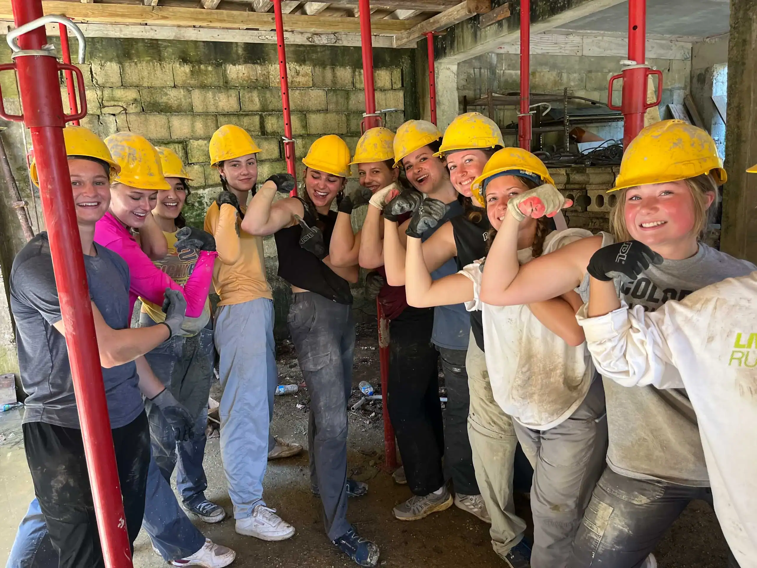 A group of young student travelers in yellow hard hats and work clothes pose together indoors, flexing their arms and smiling during a Puerto Rico service trip in a construction setting.