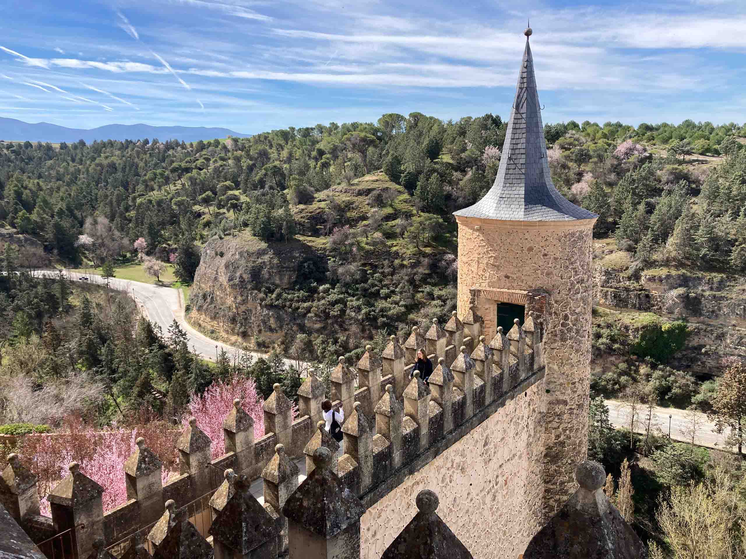 A medieval stone tower with a conical roof overlooks a lush, hilly landscape. People are visible on a walkway.