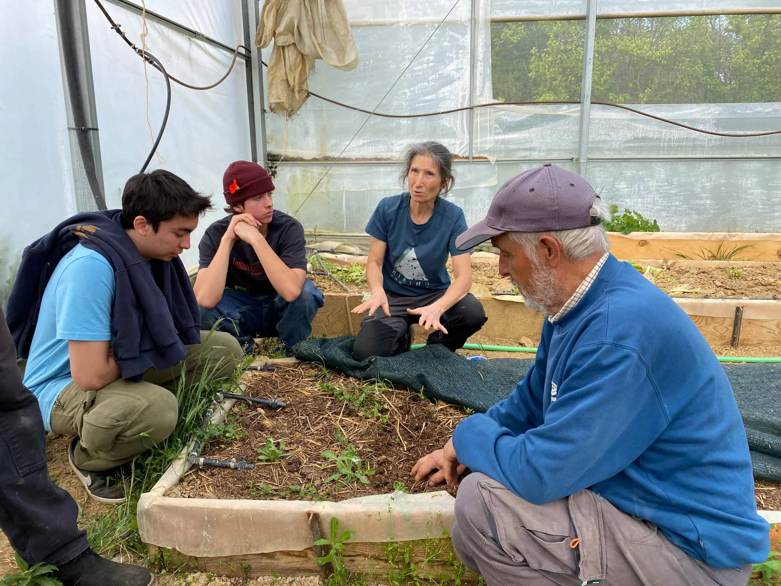 A school group travel experience unfolds as four people sit and kneel around a raised garden bed inside a greenhouse, observing and discussing the plants growing in the soil.