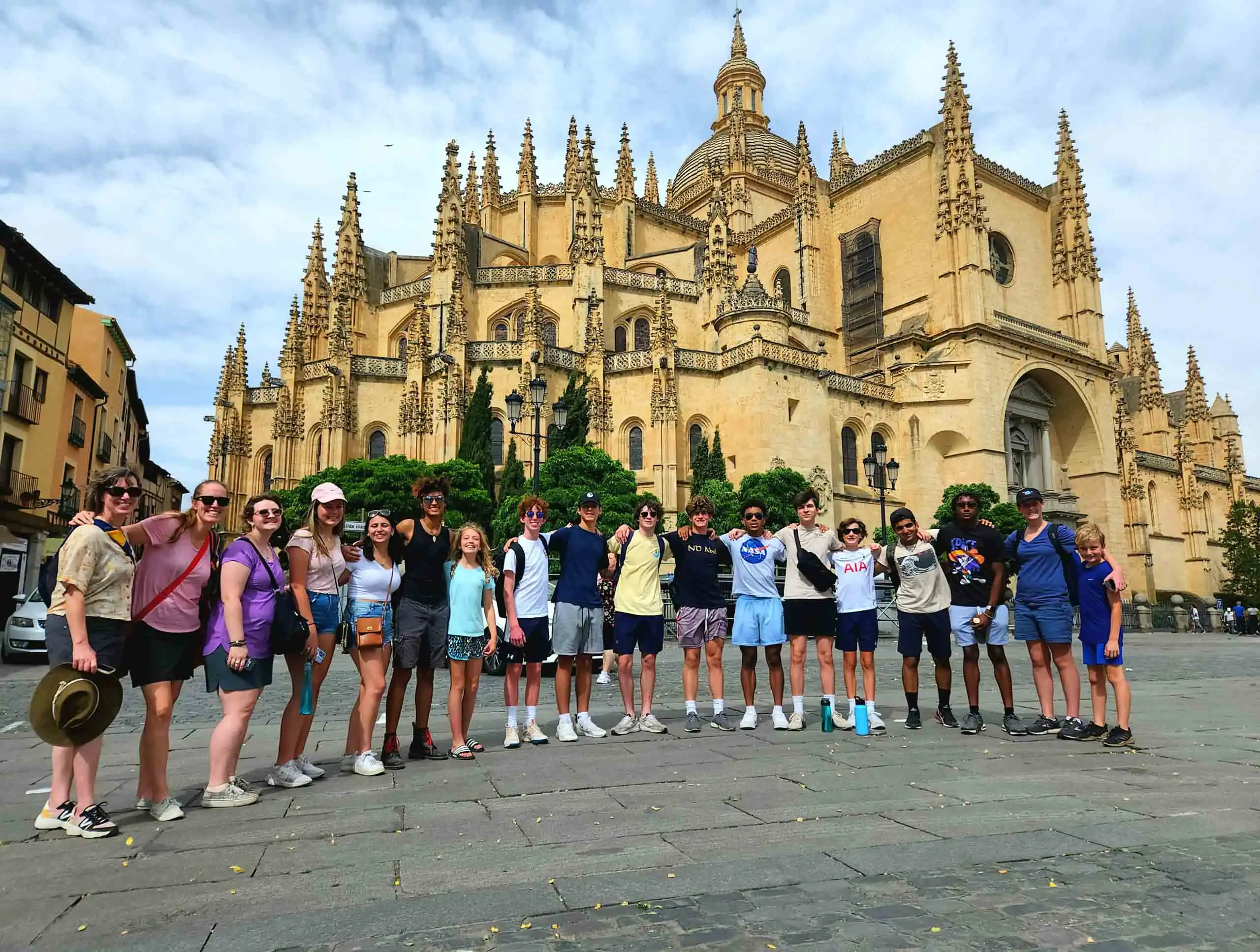 A group of people on a Spain school trip poses in front of a large, ornate historic cathedral with spires and arches on a sunny day.