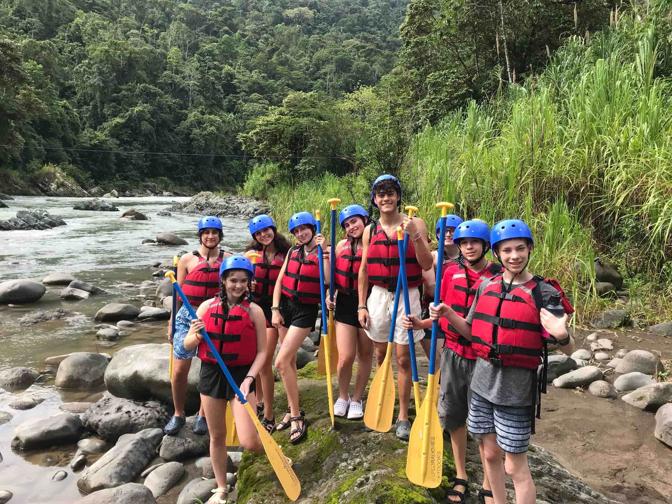 A group of people wearing helmets and life jackets stand by a river holding paddles. Forested hills are in the background.