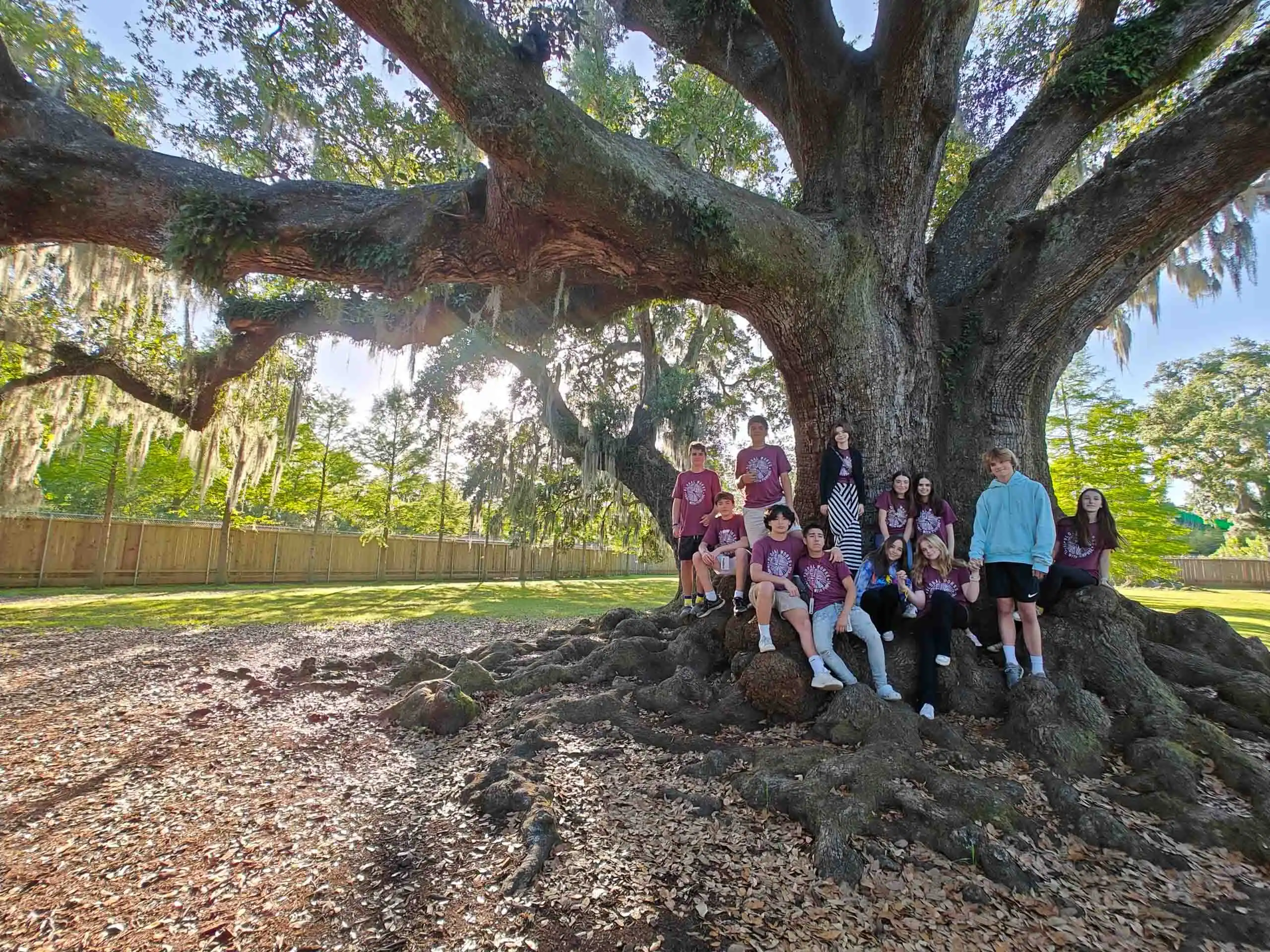 A group of people posing on and around the roots of a large tree in a sunlit park.