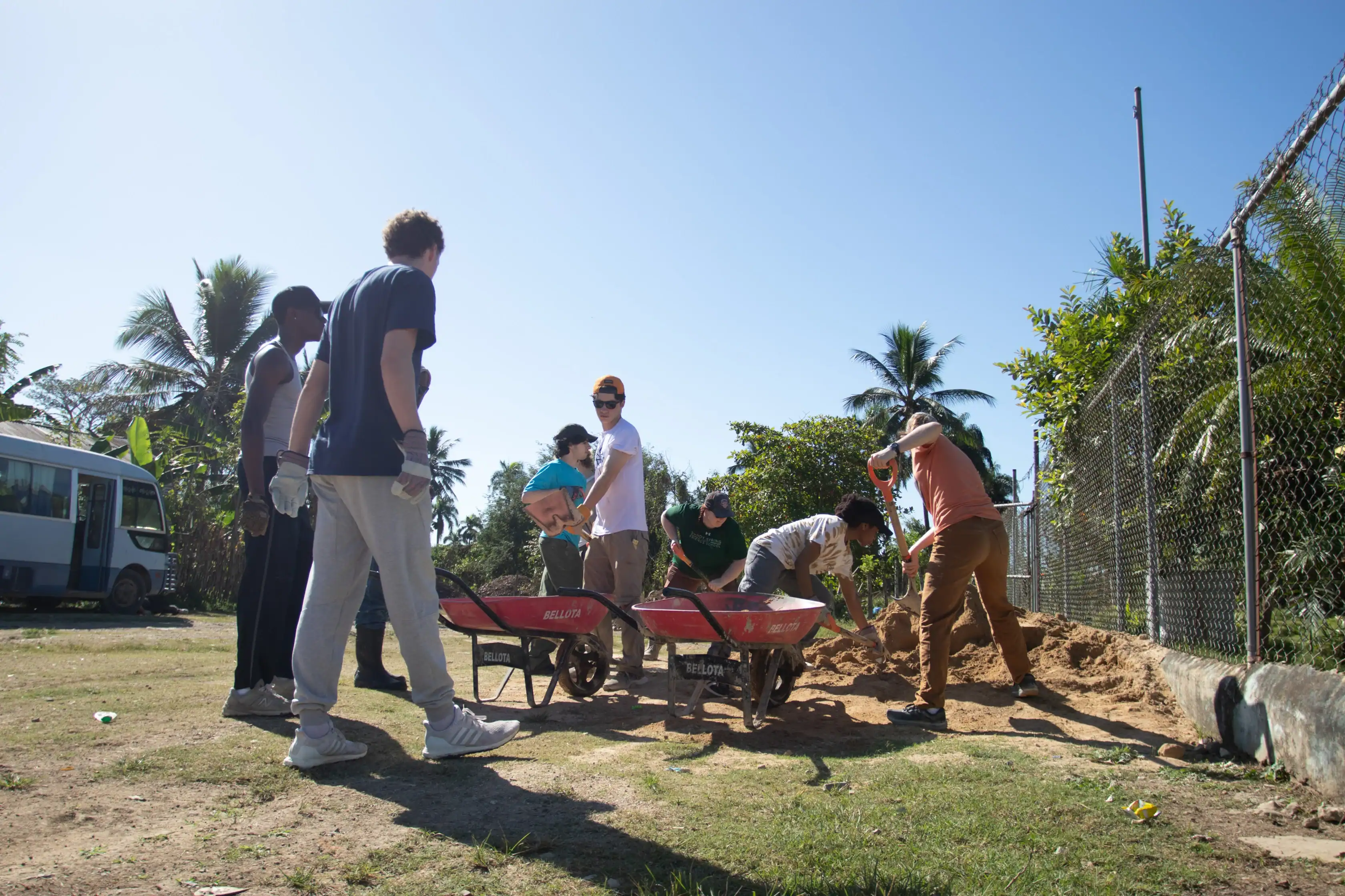 A group of people work together filling wheelbarrows with sand under a clear sky, near a fence and a white bus, in an outdoor setting with trees.