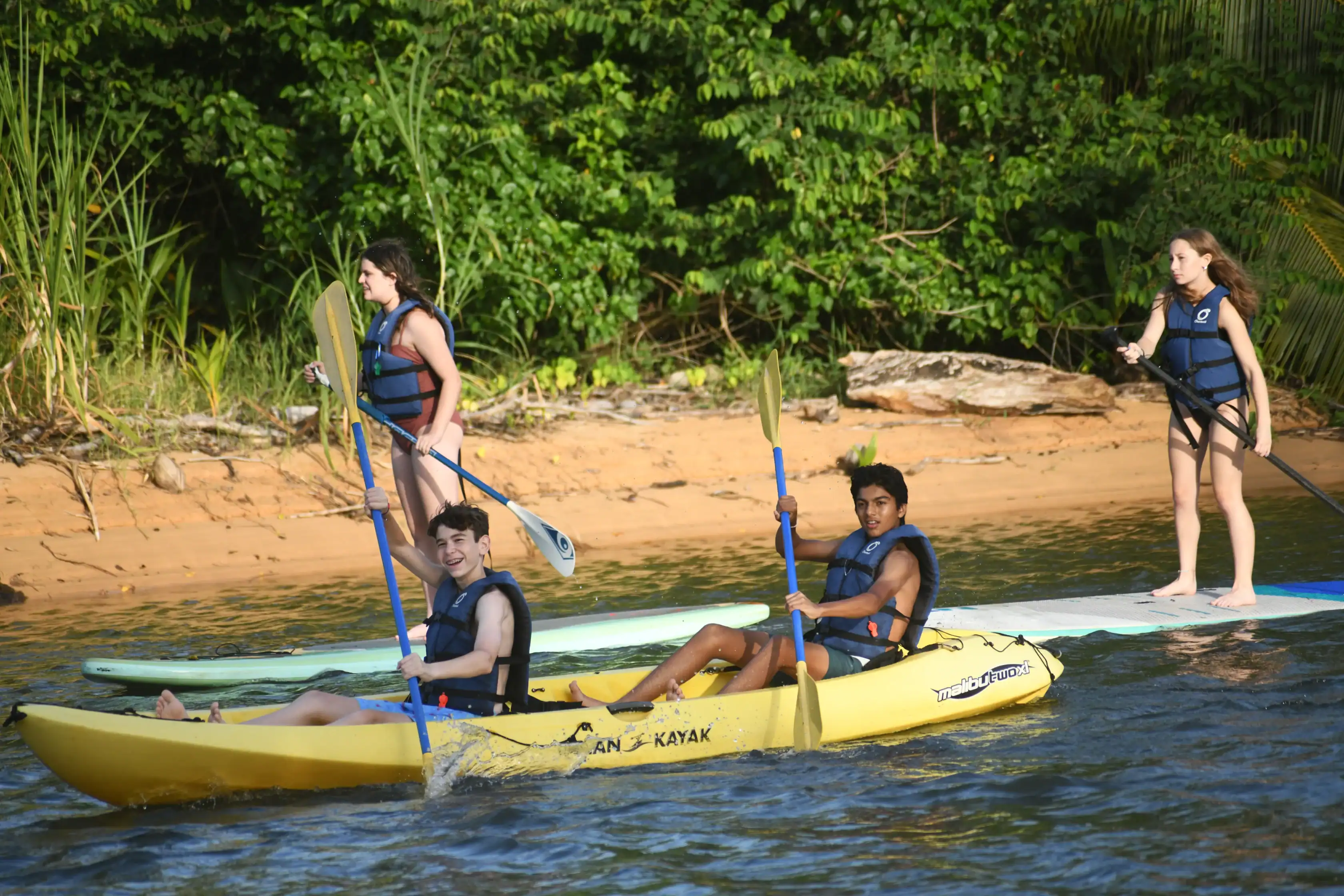 Two people paddle a yellow kayak while two others stand on paddleboards; all four wear life jackets near a wooded shoreline.
