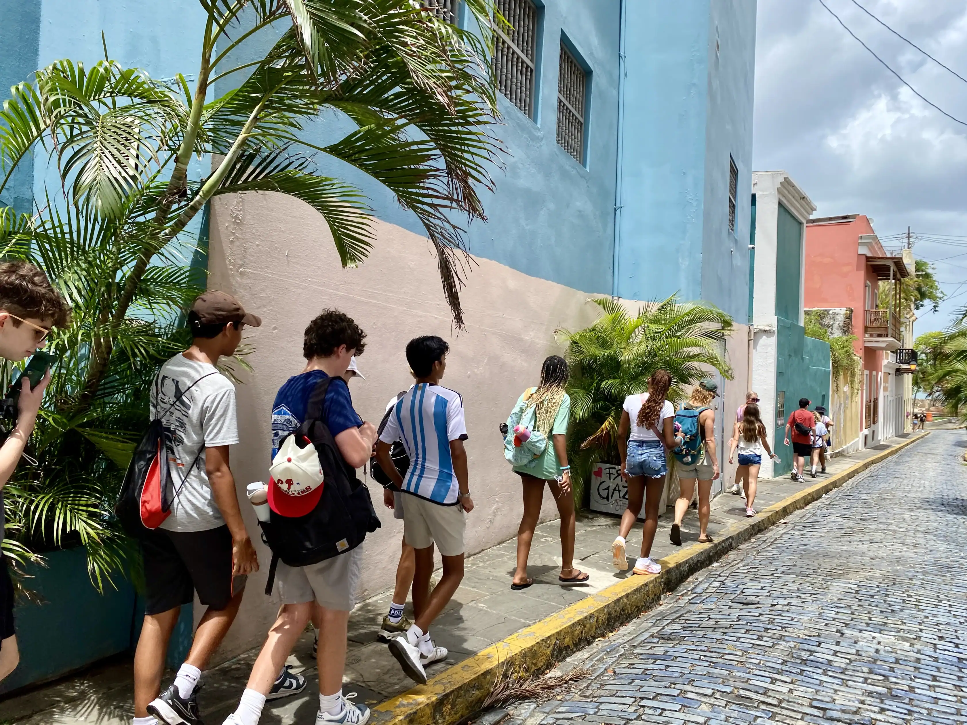 A group of people with backpacks walk along a narrow, colorful city street lined with palm plants and cobblestones under a cloudy sky.