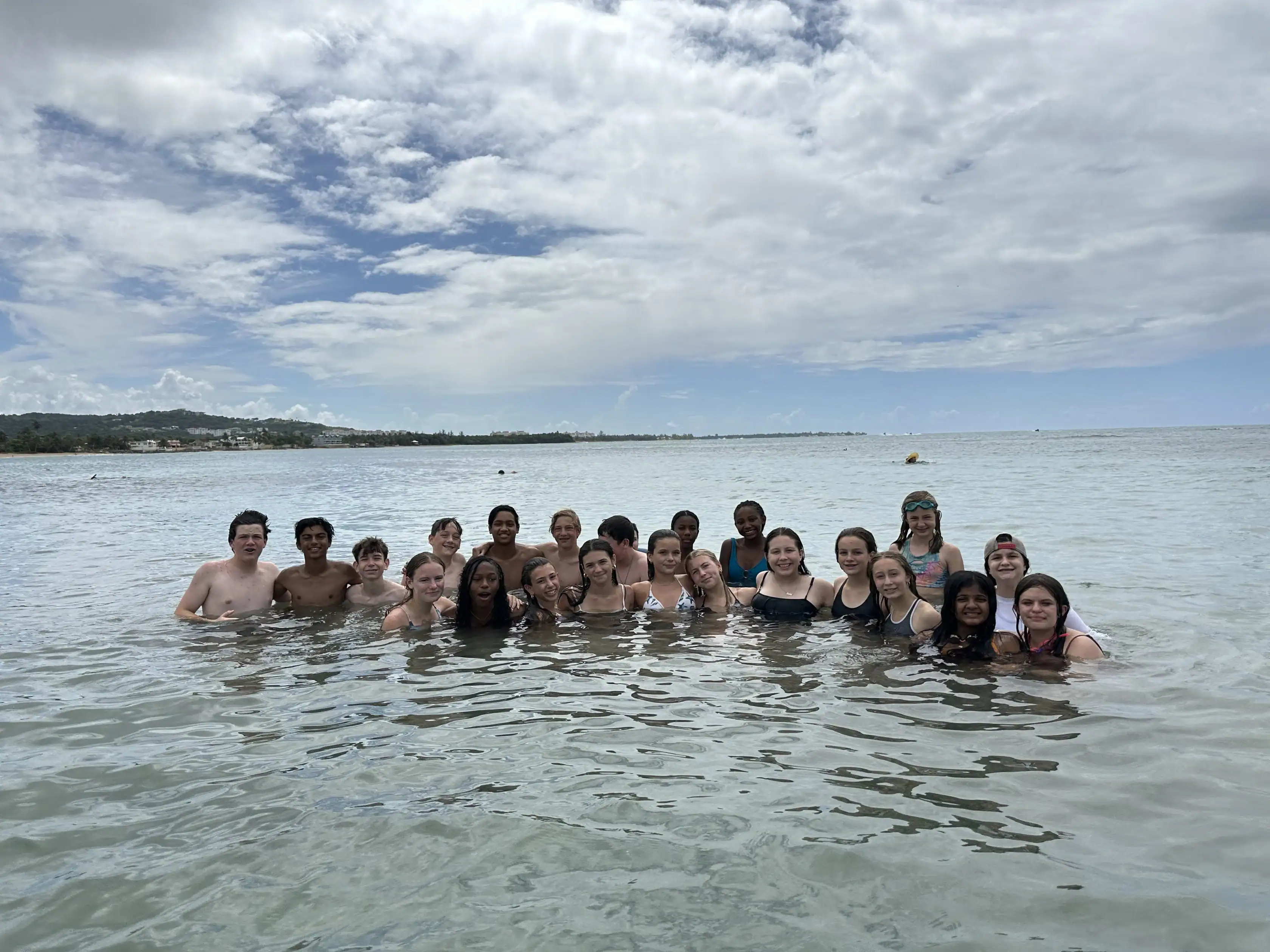 A group of people stand together in shallow ocean water near the shore on a cloudy day.