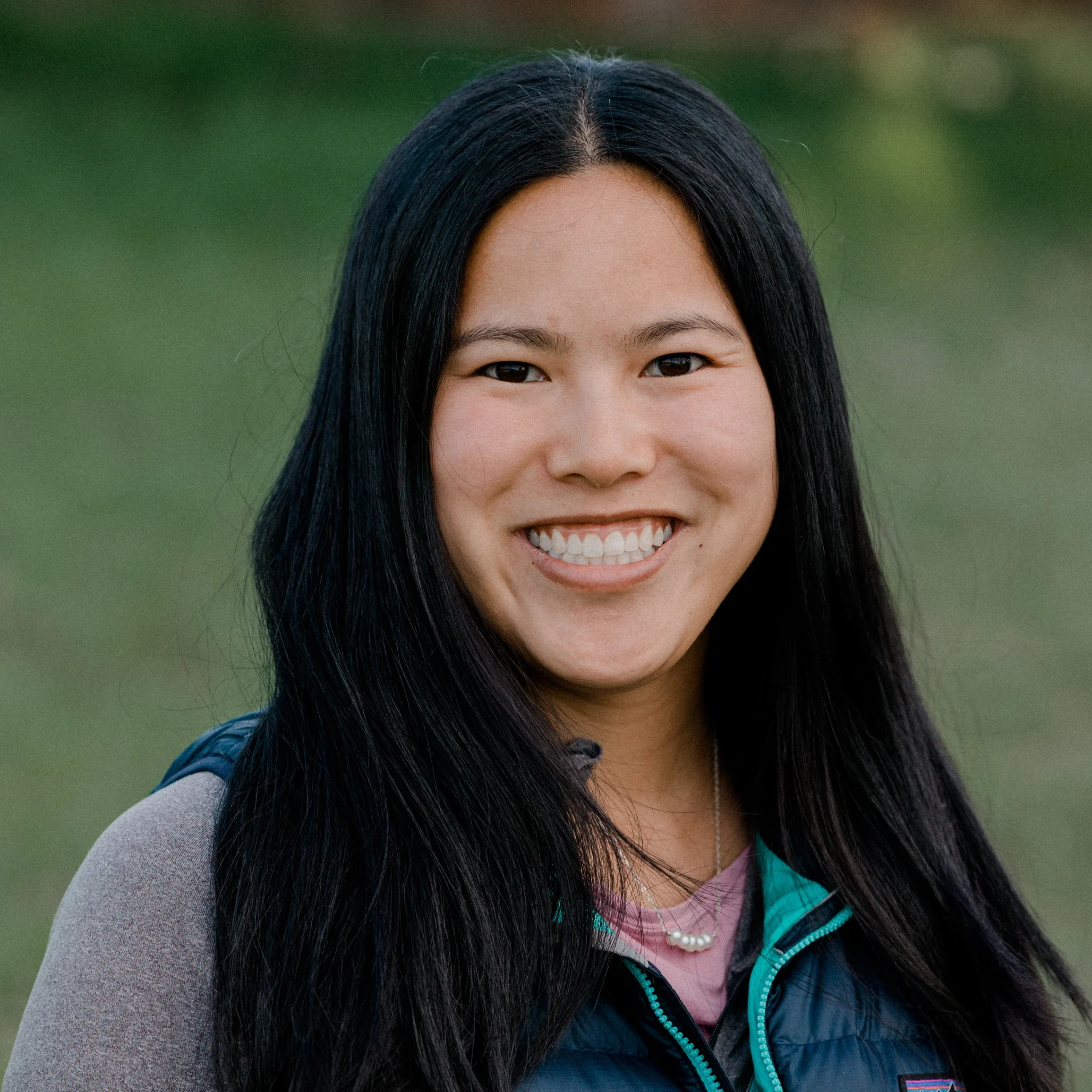 A smiling person with long dark hair wearing a blue vest and gray top stands outdoors.