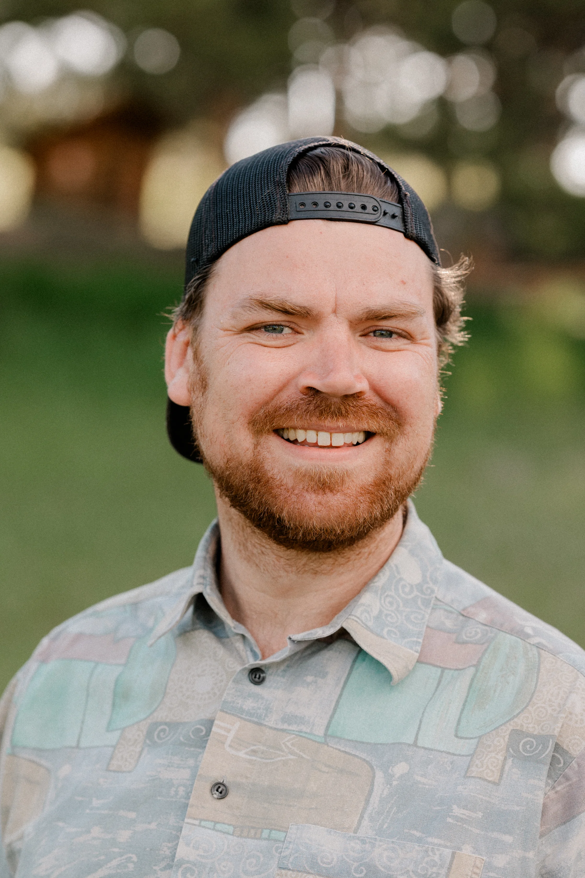 A man with a beard wearing a backward cap and patterned shirt smiles outdoors with a blurred green background.