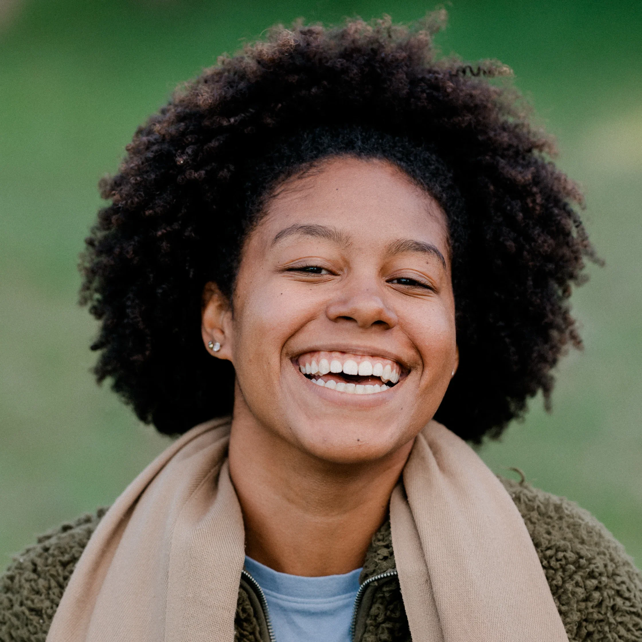 Smiling person with curly hair wearing a tan scarf and a green fleece jacket, standing outdoors.