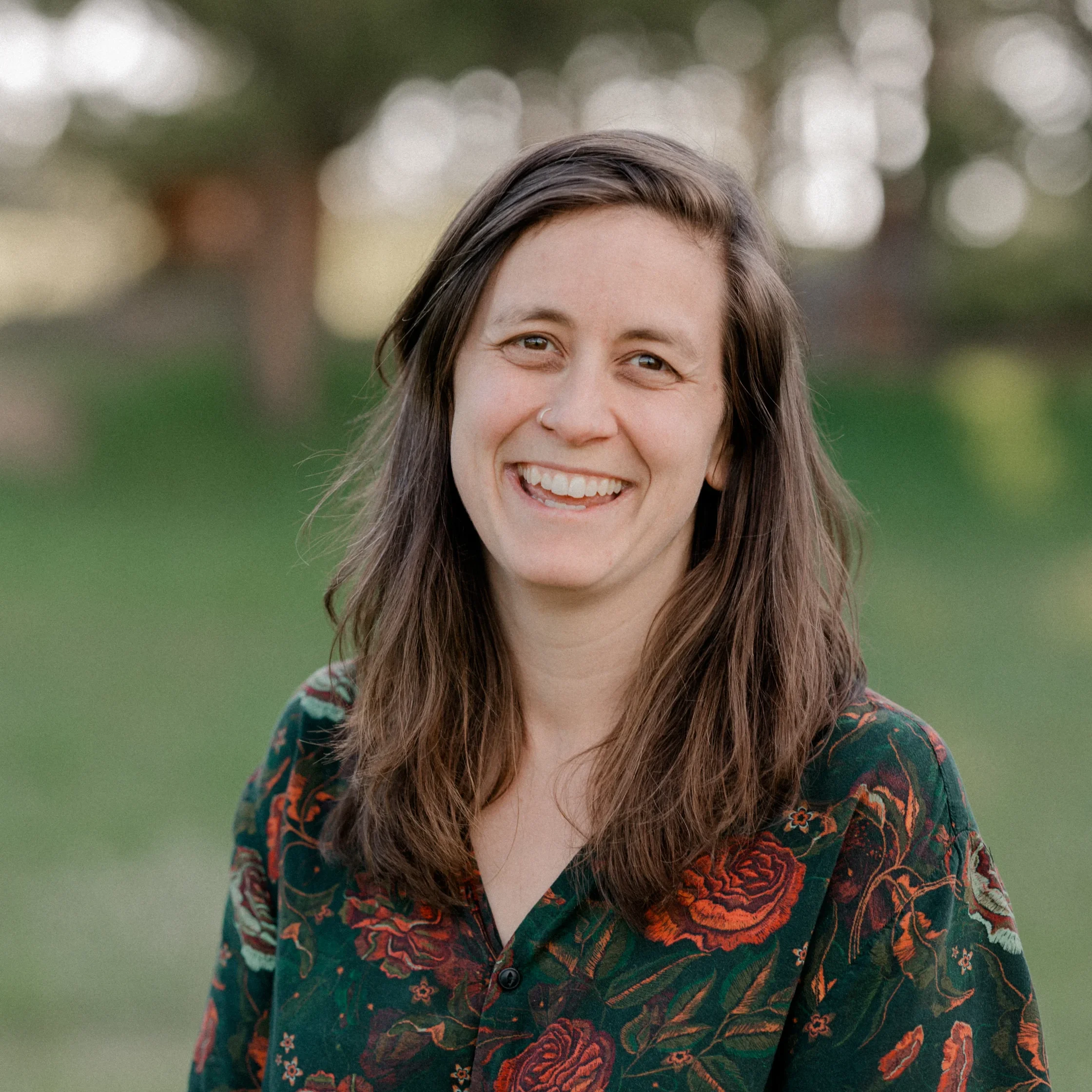 A person with long brown hair, wearing a floral-patterned shirt, smiles outdoors in a grassy area.