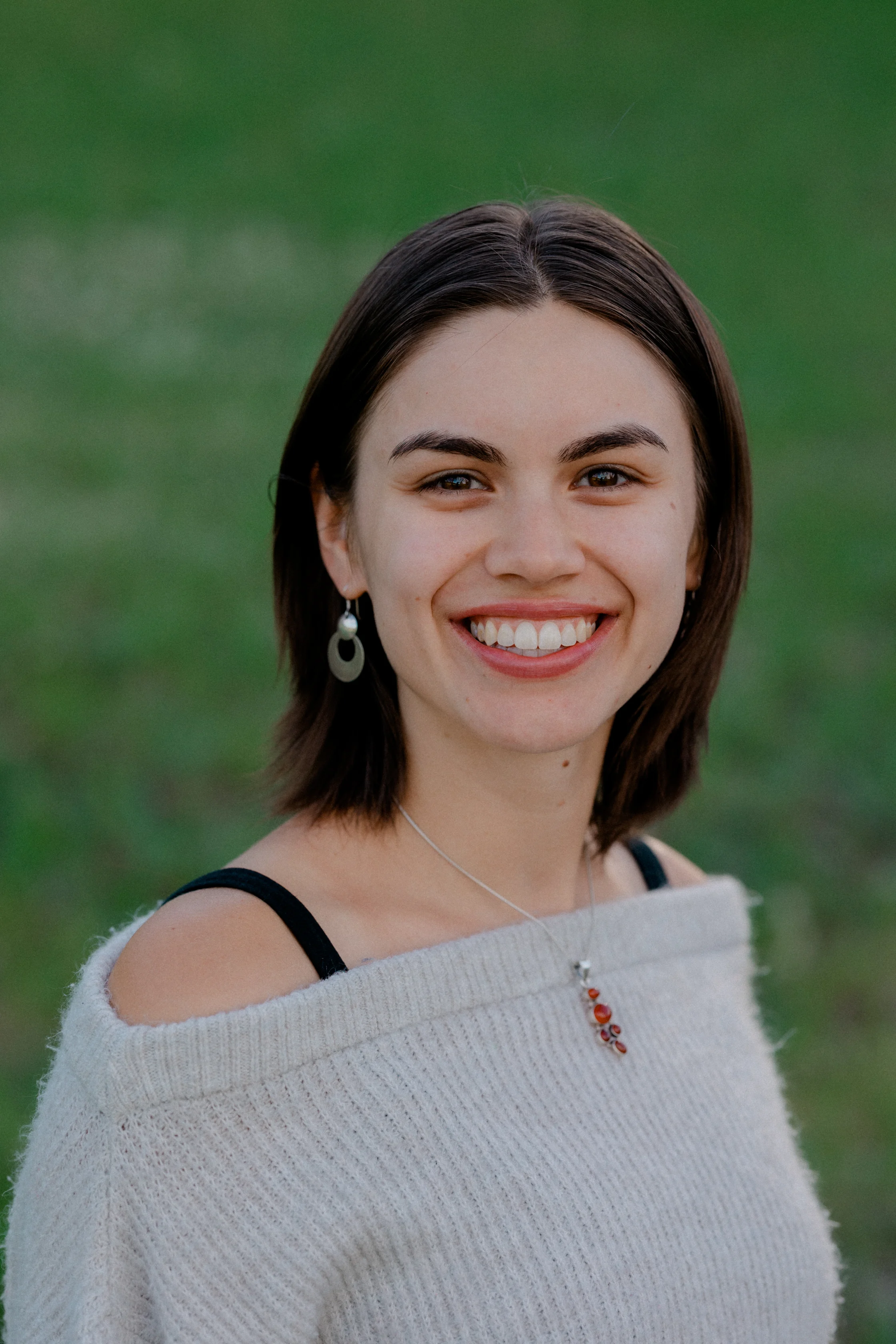 A person with short brown hair smiles at the camera, wearing a light-colored off-shoulder sweater, earrings, and a necklace, standing in front of a blurred green background.