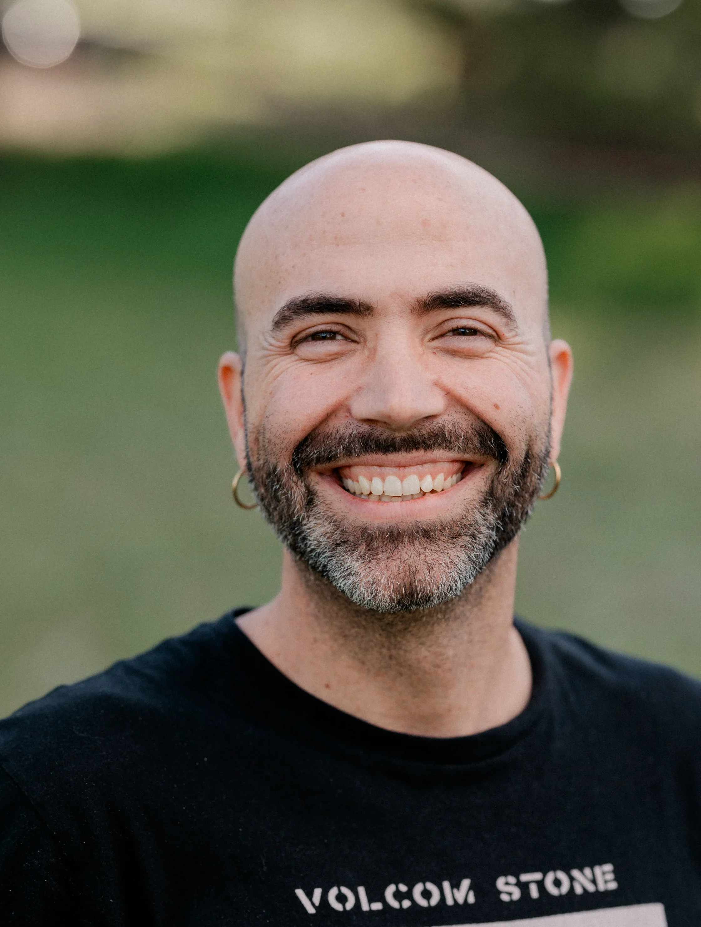 A man with a beard and hoop earrings smiles broadly. He is wearing a black Volcom Stone T-shirt. A blurred green background is visible.