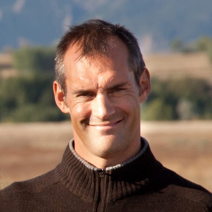A man in a brown zip-up sweater smiles in an outdoor setting with trees and hills in the background.