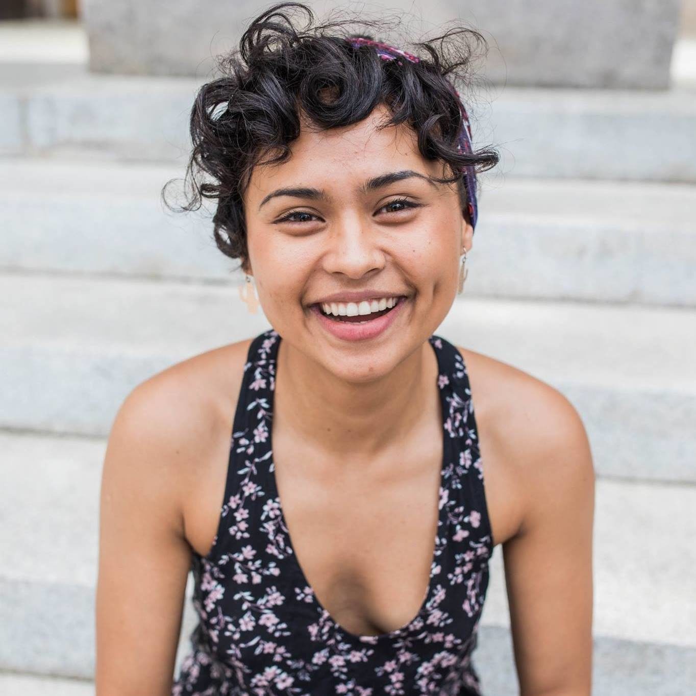 A person with curly hair and a headband smiles while sitting on outdoor steps, wearing a floral-patterned top.