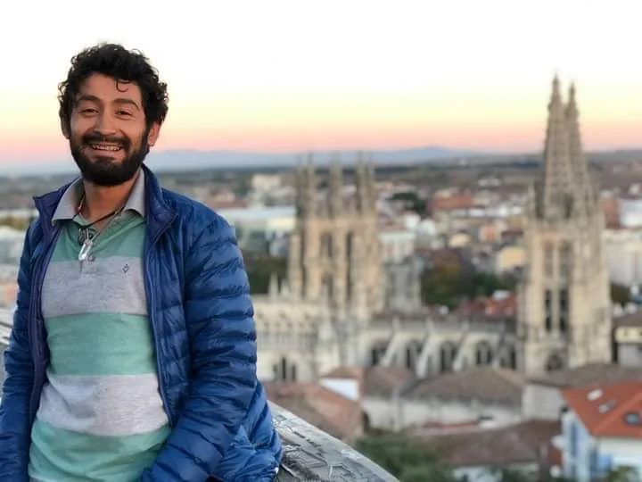 A person with a beard smiles at the camera while standing in front of a blurred cityscape and cathedral at sunset.