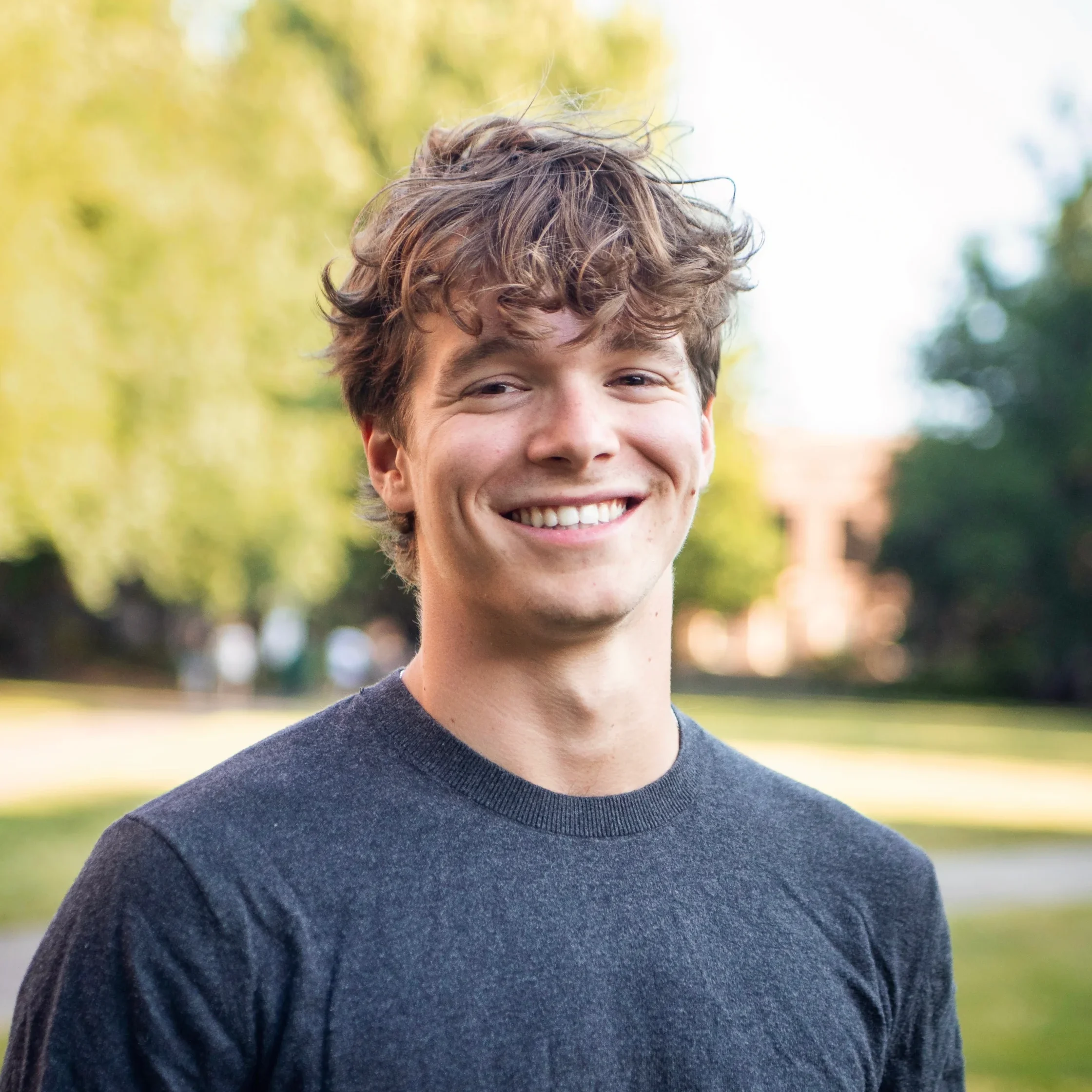 A young man with wavy brown hair and a dark sweater stands outdoors, smiling, with blurred trees and grass in the background.