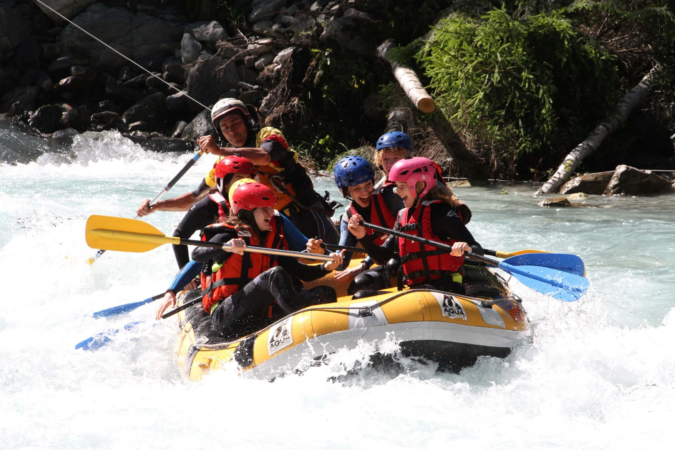 Six people wearing helmets and life jackets paddle an inflatable raft through whitewater rapids surrounded by rocks and vegetation, showcasing the excitement offered by summer teen travel programs.