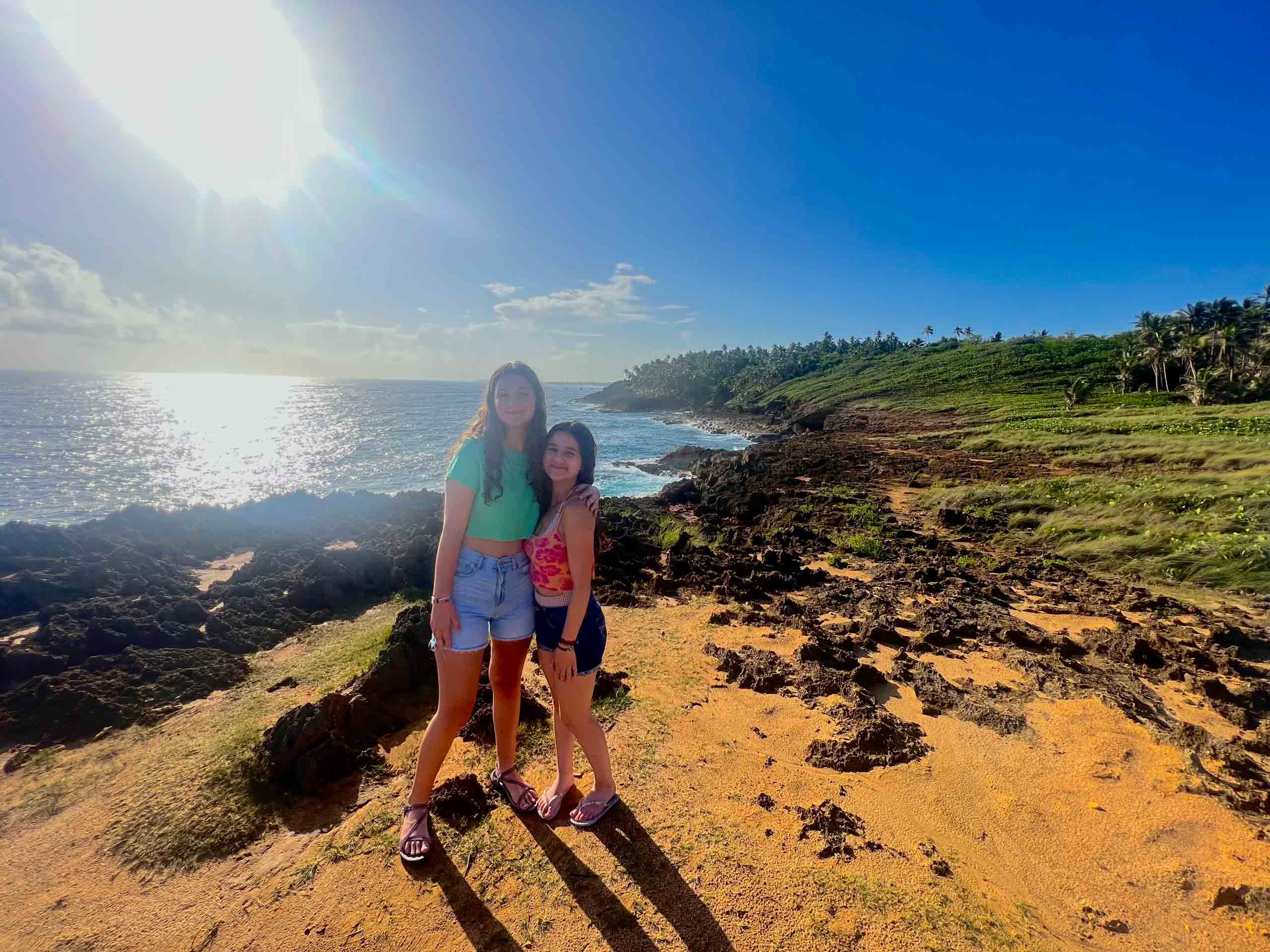 Two people stand on rocky terrain by the ocean under a clear blue sky, with sunlight reflecting on the water.