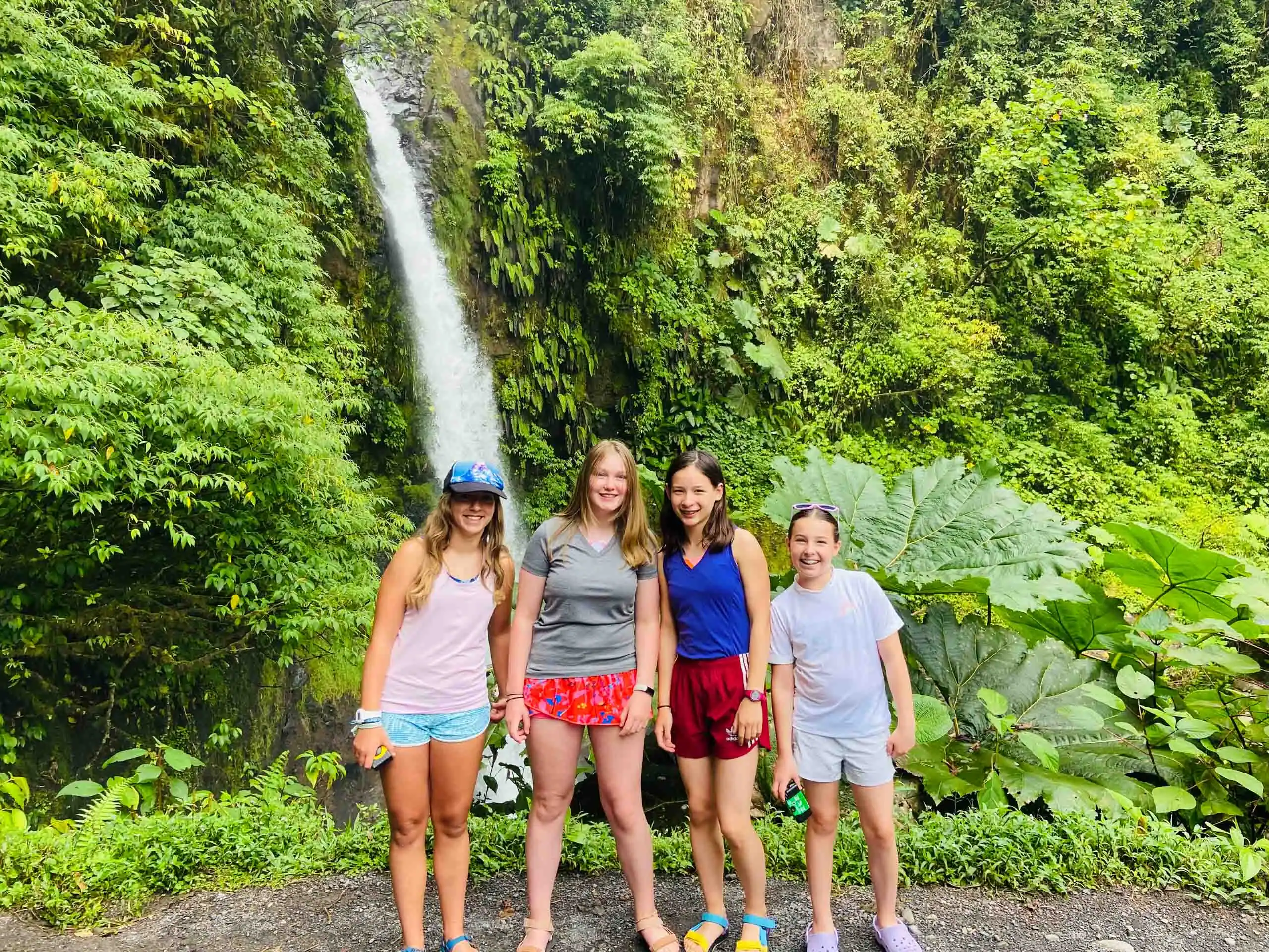 Four girls, during student travel to Costa Rica, stand on a path in front of a tall waterfall surrounded by dense green vegetation.
